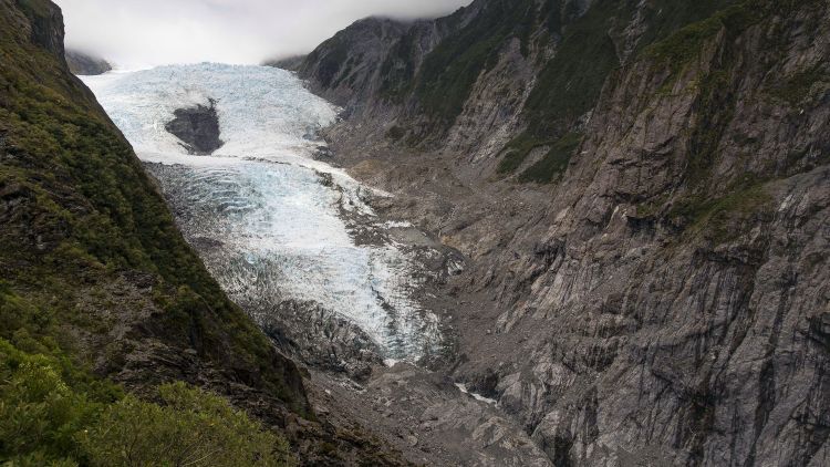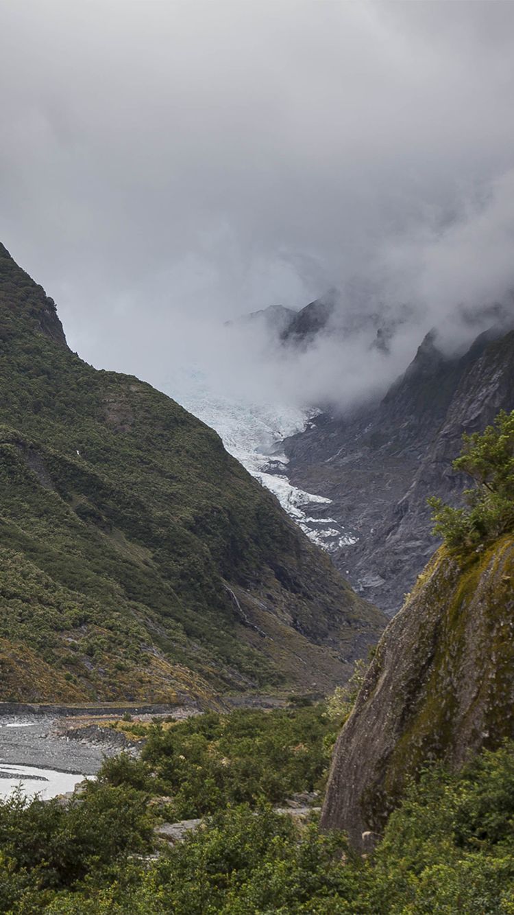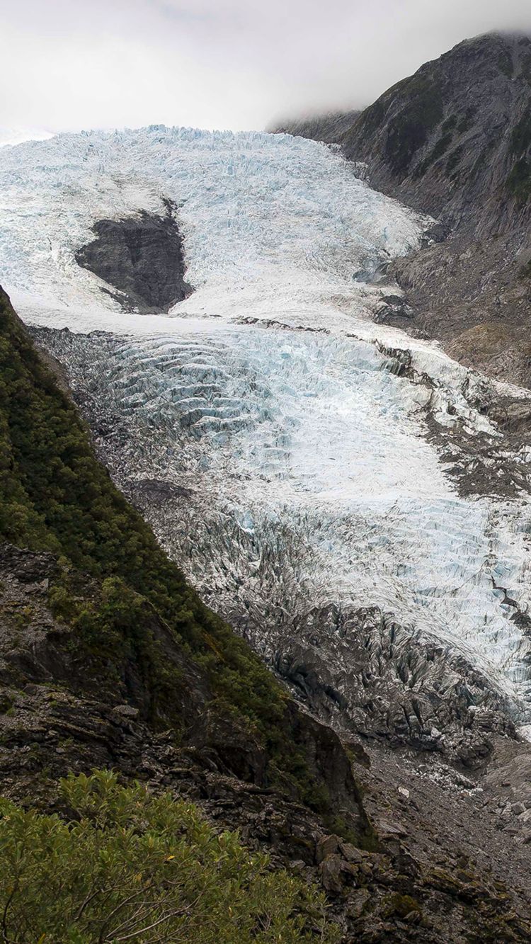A few days earlier, ex-tropical cyclone Fehi had landed on the West Coast, destroying roads and flattening buildings in Glacier Country. But nevertheless, the path to Franz Josef glacier is packed. The car park is straining with rented campervans and tour buses, their colourful slogans popping in the grey valley.