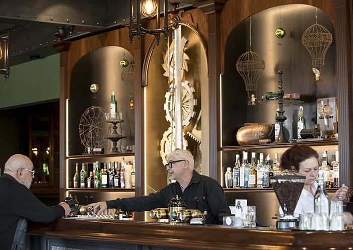 Grand renovation plans faltered and for years its tired facade spoke of stalled hope. That changed when, in December, owners Janelle Harrington and Rob Allen opened the door to a steampunk themed boutique hotel and restaurant, with intricate timepieces bought at antique auctions, bell jars of oddities placed like museum displays and black and white tiled bathrooms with snaking copper pipes.