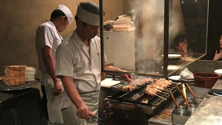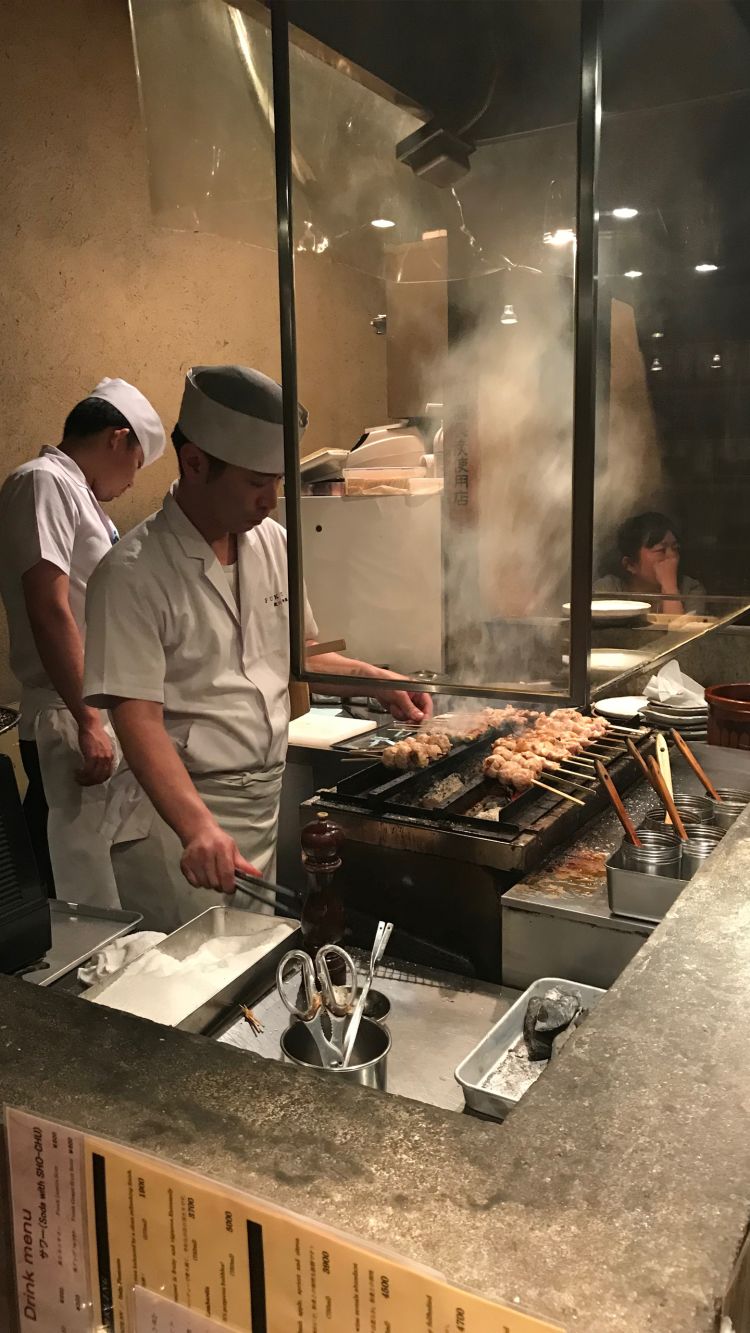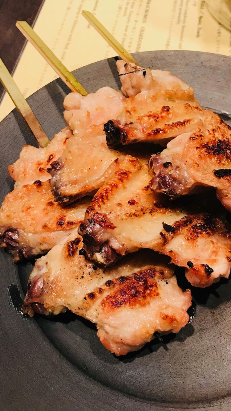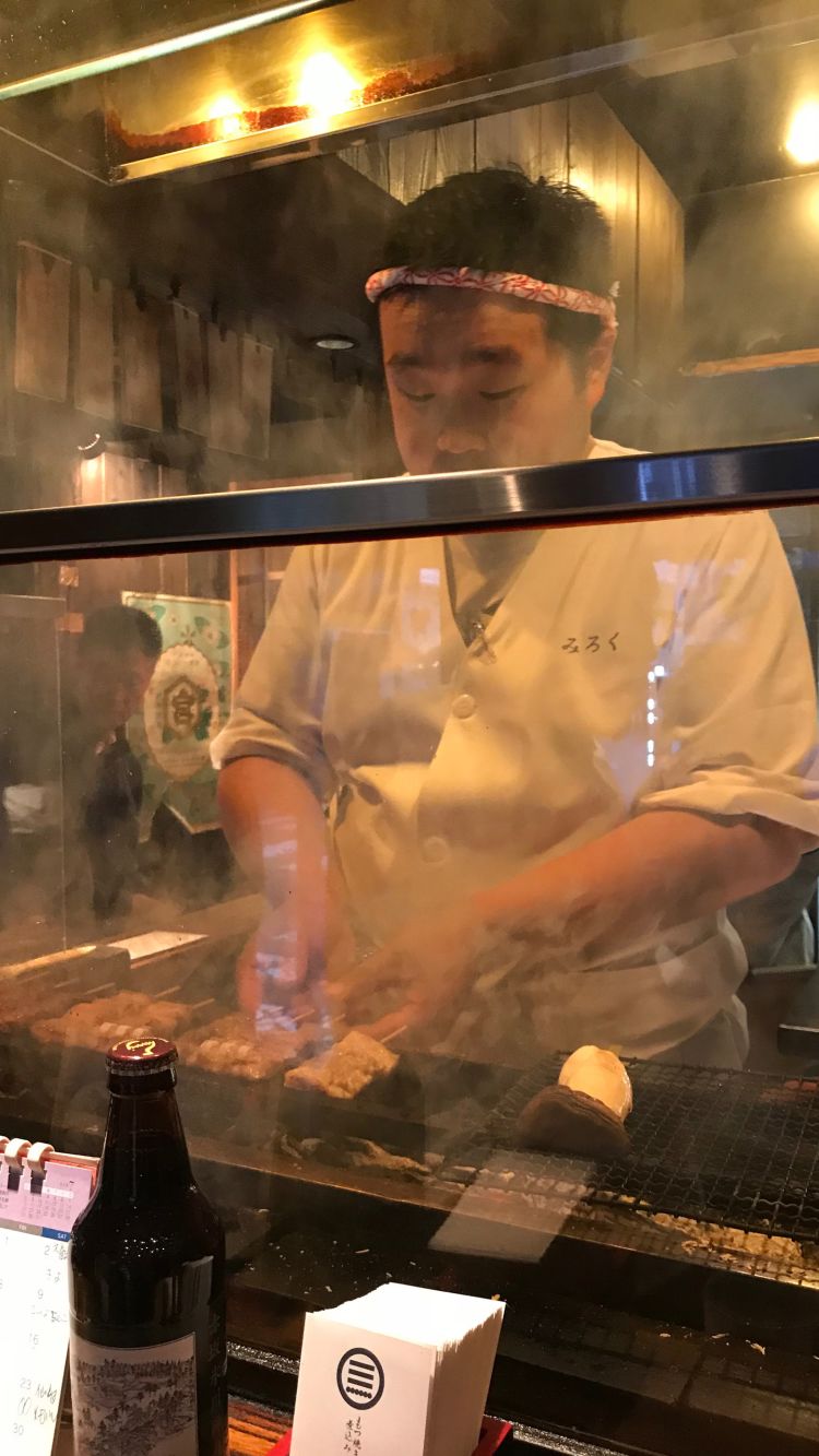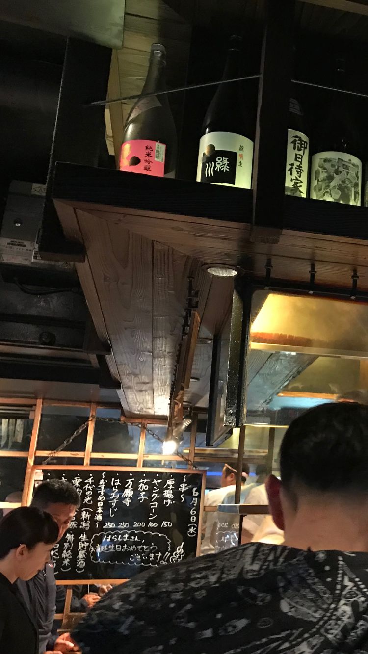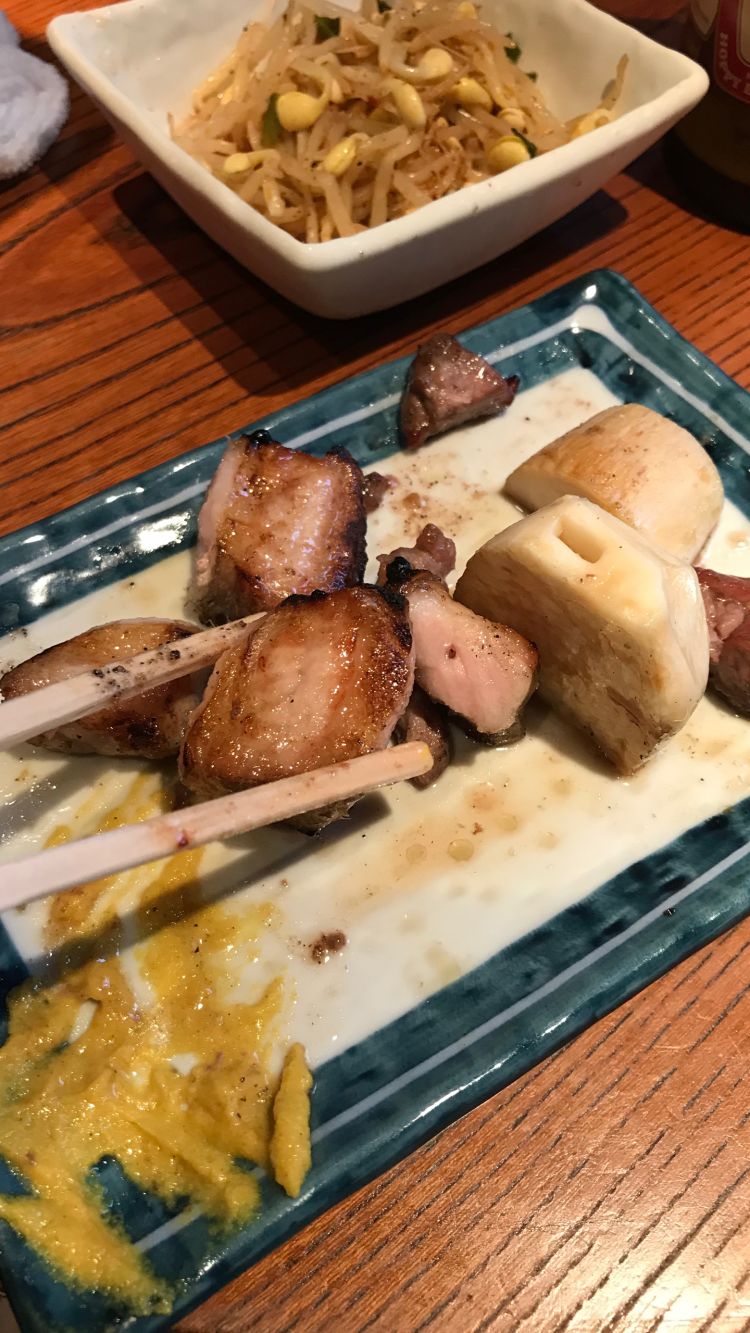 A casual affair. A stand-up yakiton bar in Akasaka, skewer sampling including pig’s anus - it was fatty.