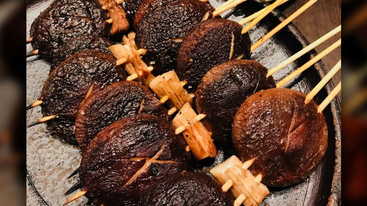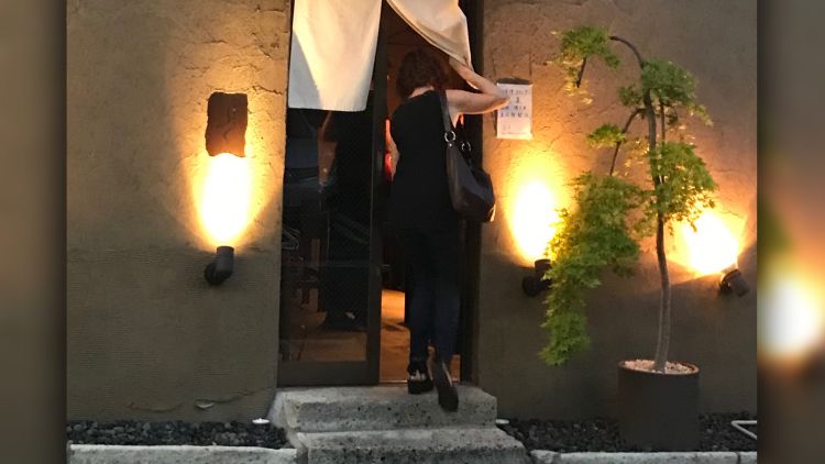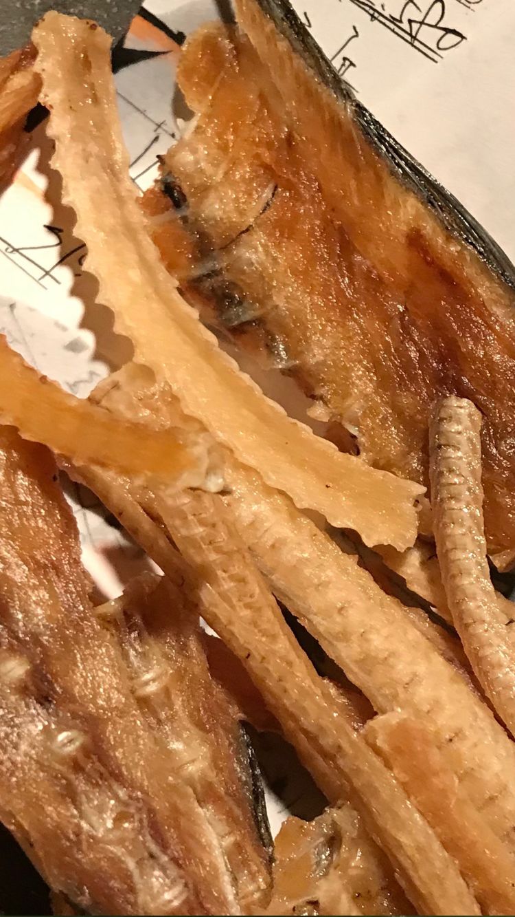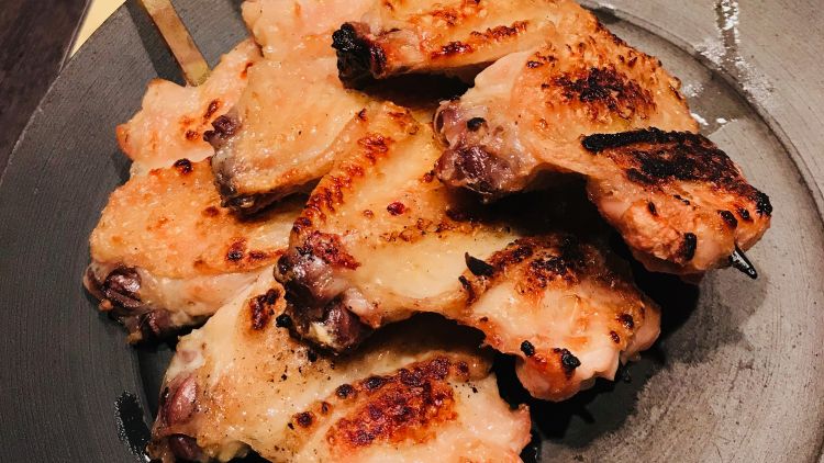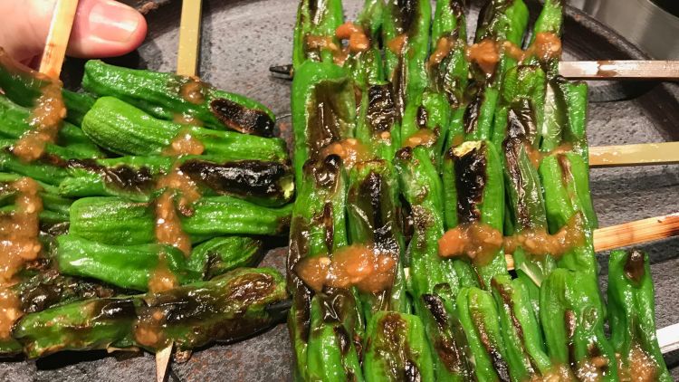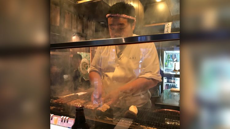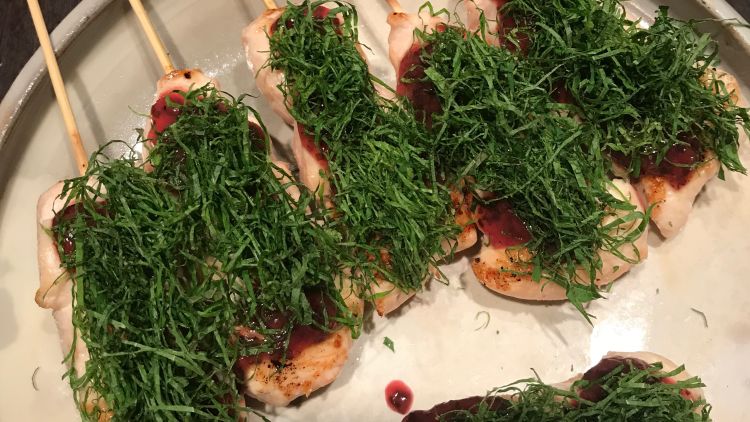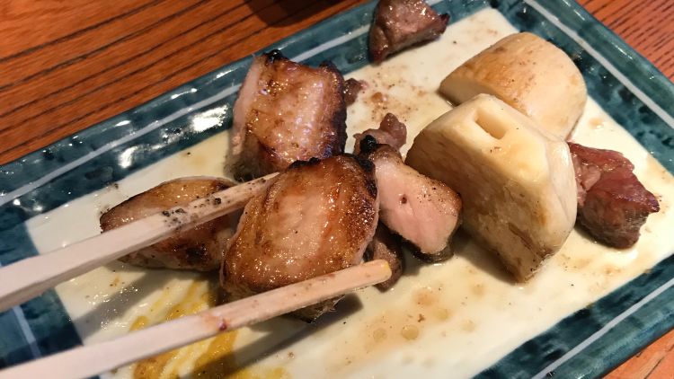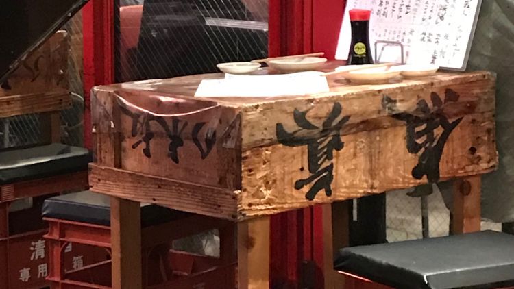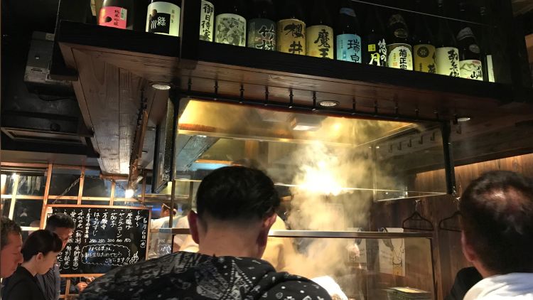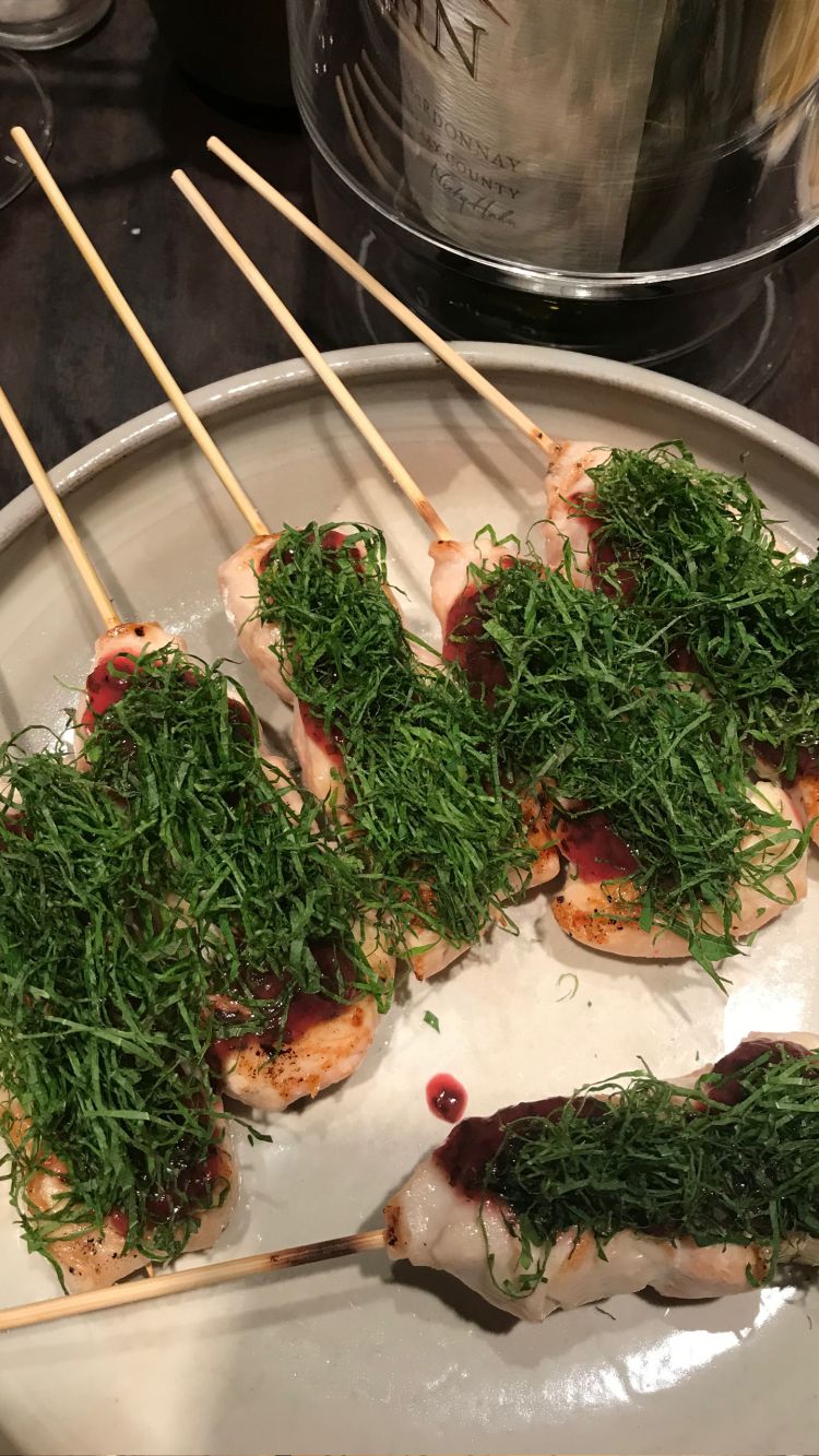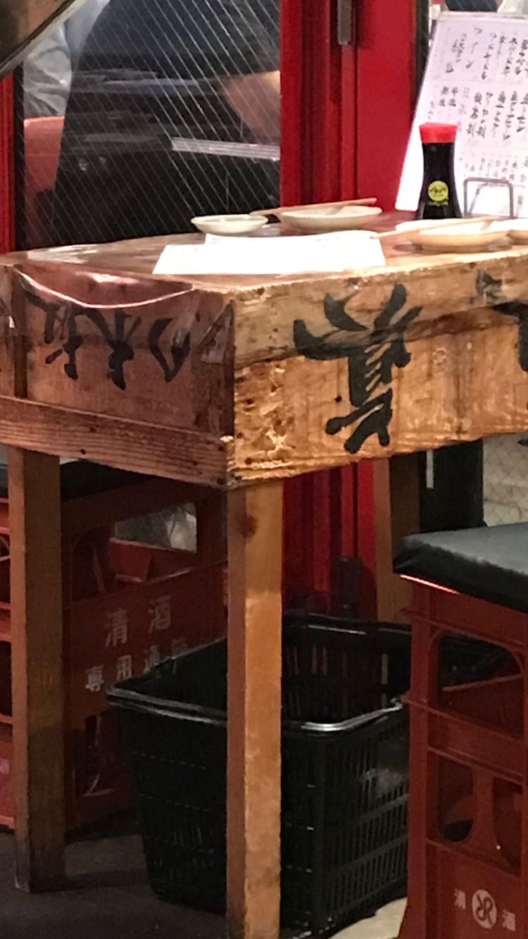 A casual affair. A stand-up yakiton bar in Akasaka, skewer sampling including pig’s anus - it was fatty.