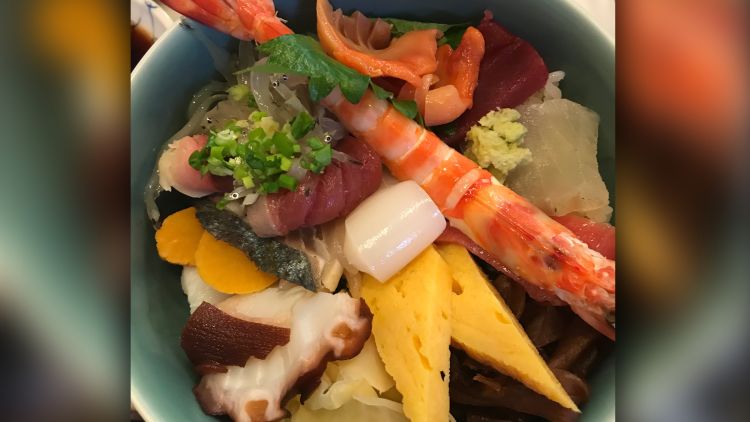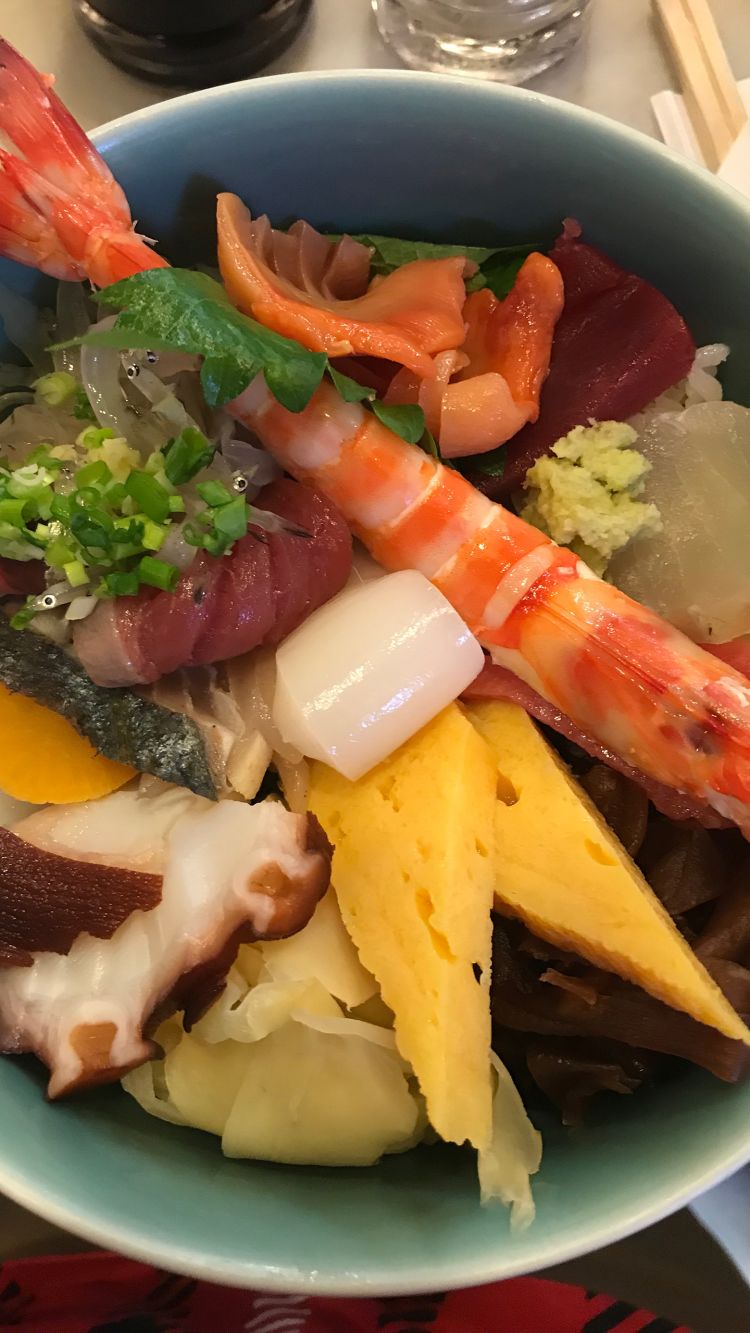 Chirashi sushi for breakfast is the real deal - shrimps, octopus, mackerel - piled up in a bowl.