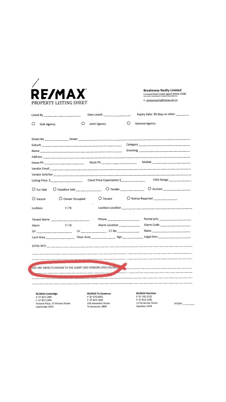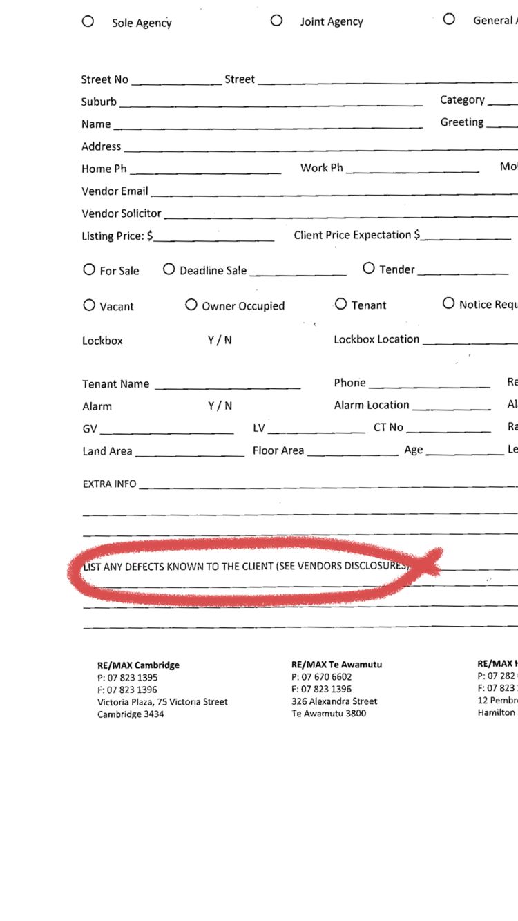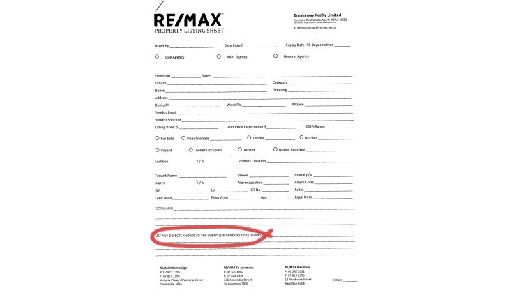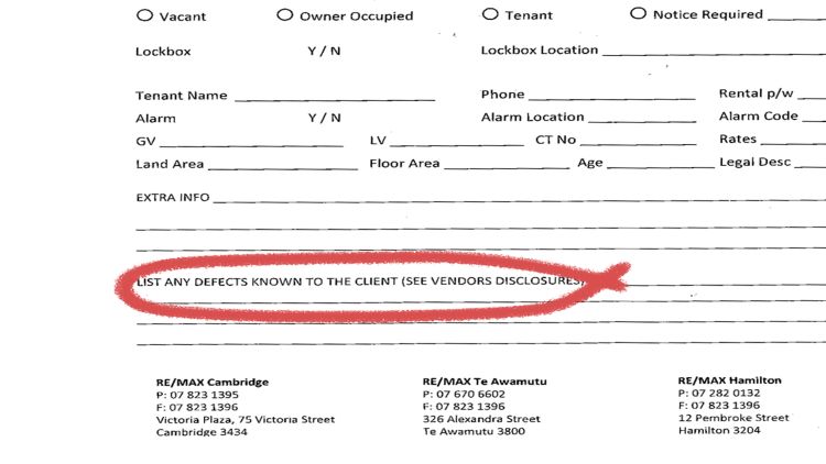 In fact, there were five specific occasions. There were two real estate listings forms. And two sale and purchase agreements completed - one set for the collapsed Dean deal, one for the Warburton deal. Both had sections which asked vendors to “list any defects or problems known to the client”.