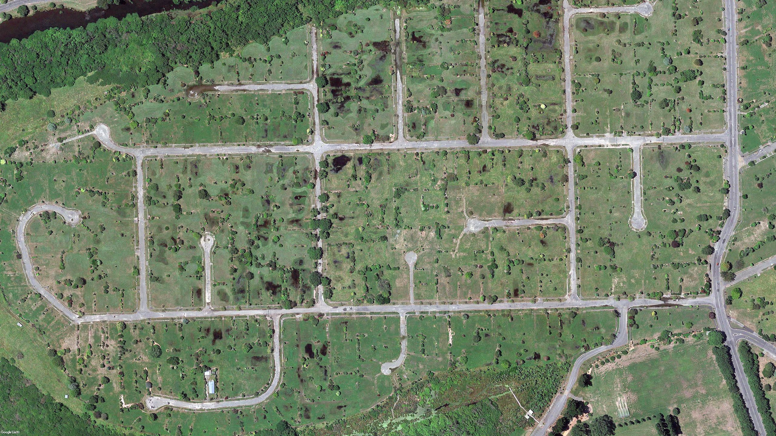 Every house has been torn down, every driveway grassed over, every swimming pool filled. All that remains are the criss-crossing roads, now overgrown and cracked, and the rickety powerline poles starting to sag with the land underneath.