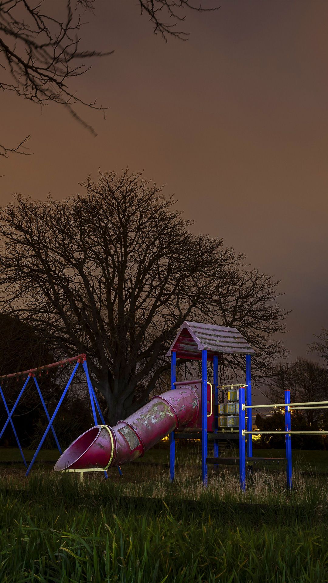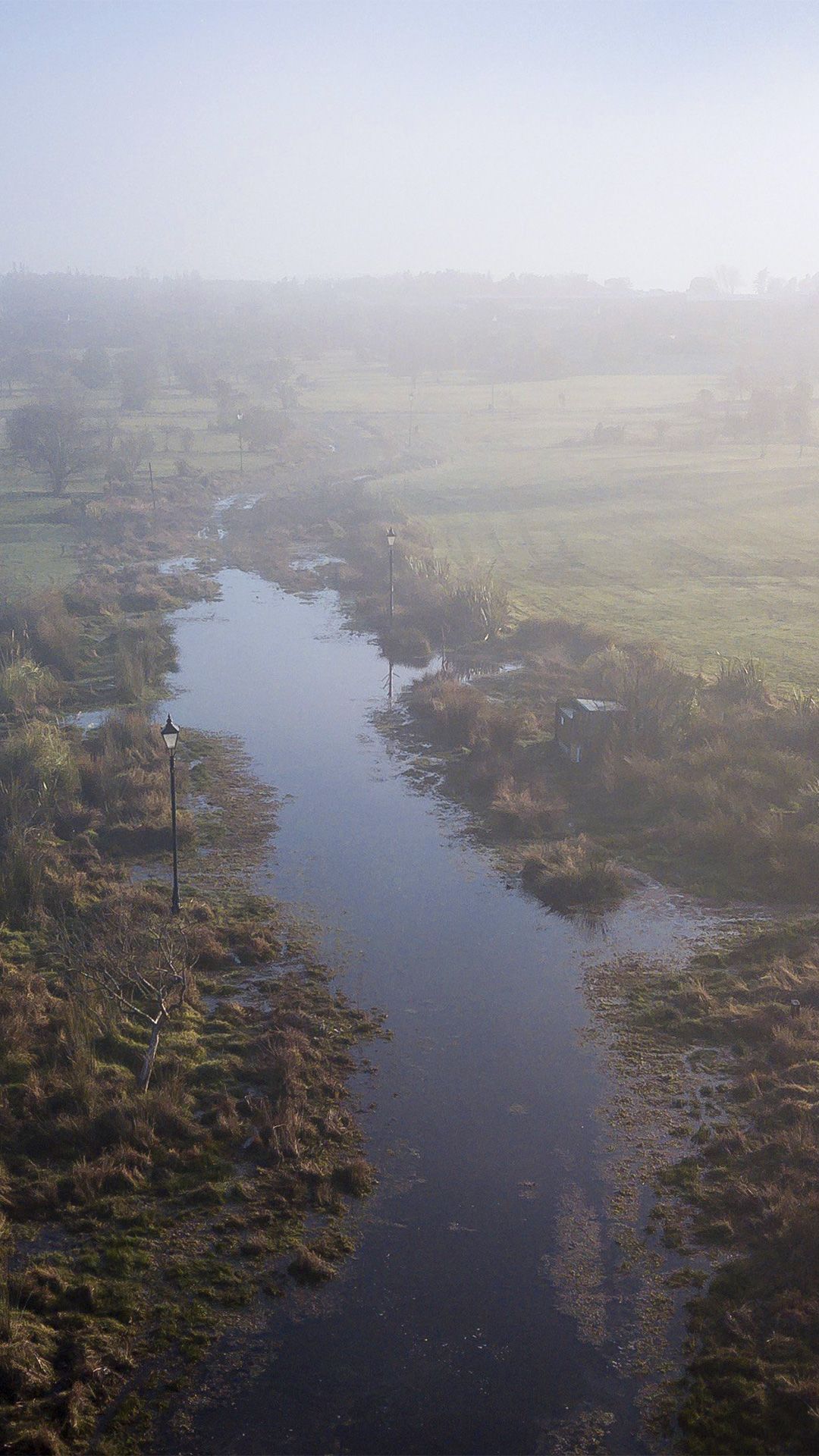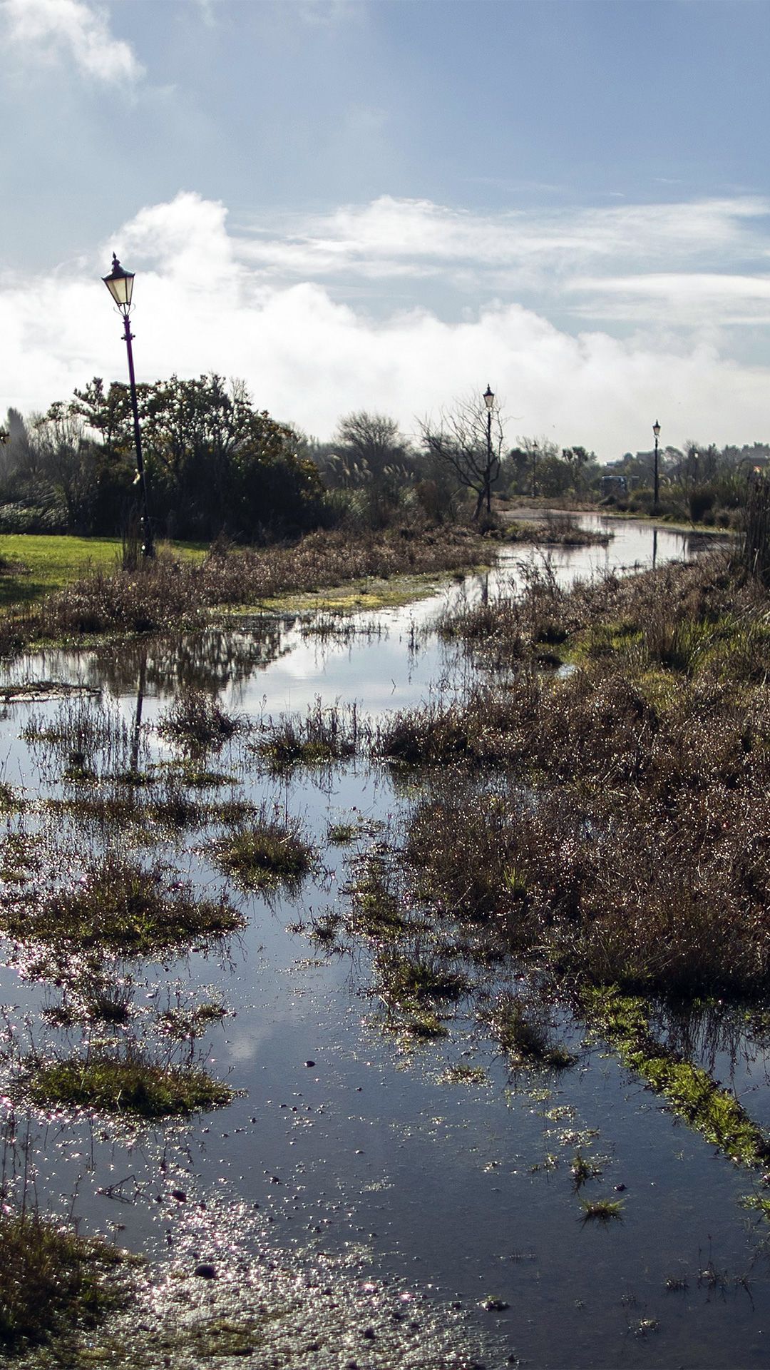 The distinctively wide cul-de-sac, sinking into the mud, is now permanently underwater; green, brackish plant-life is colonising its edges, and the gardens of its former residents, angled straight like arrows, remain untouched.