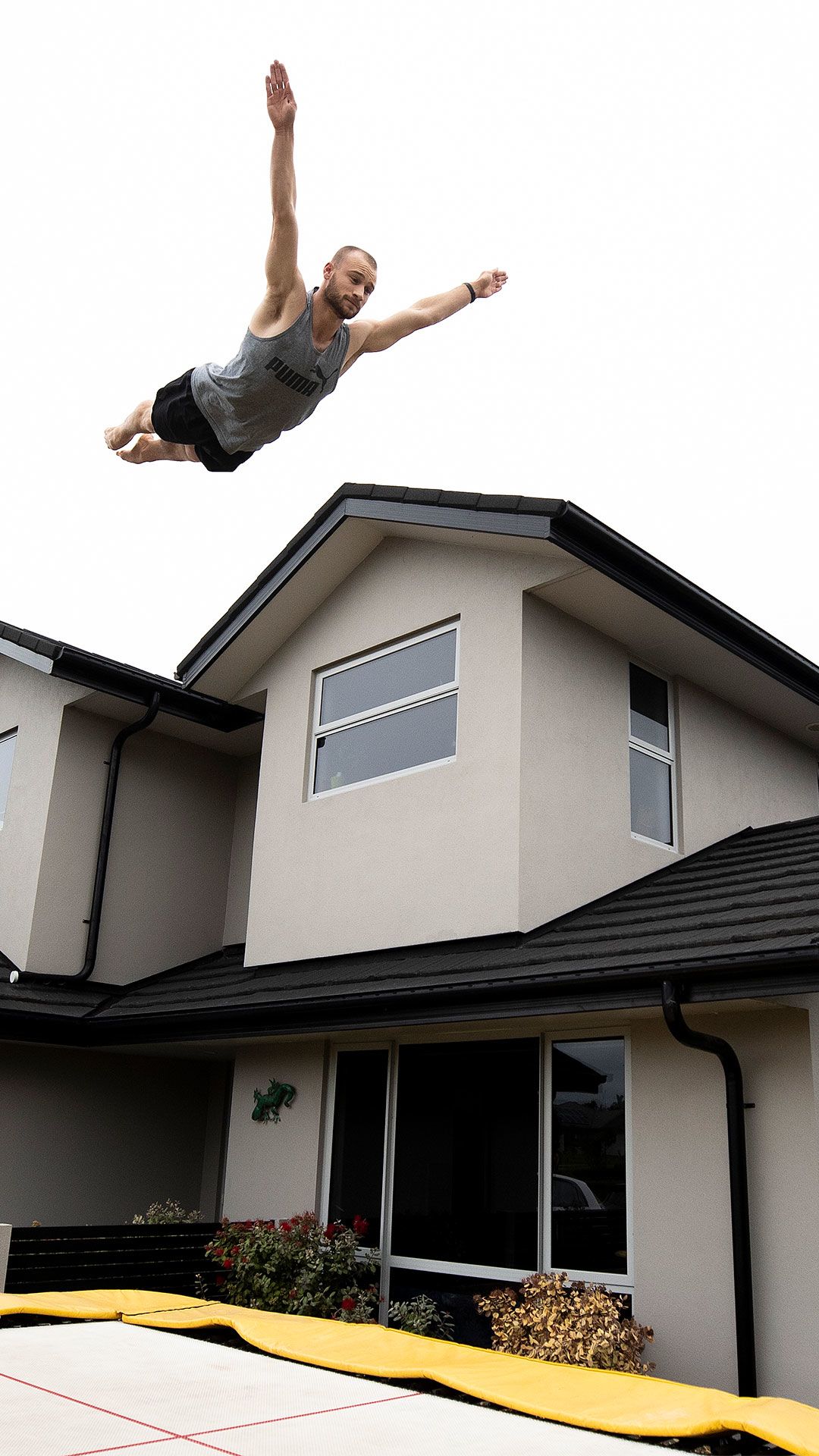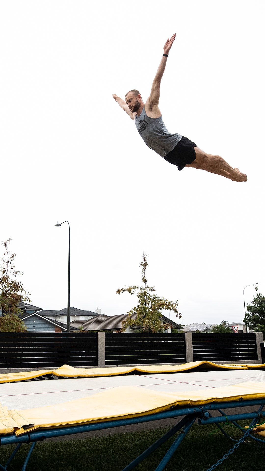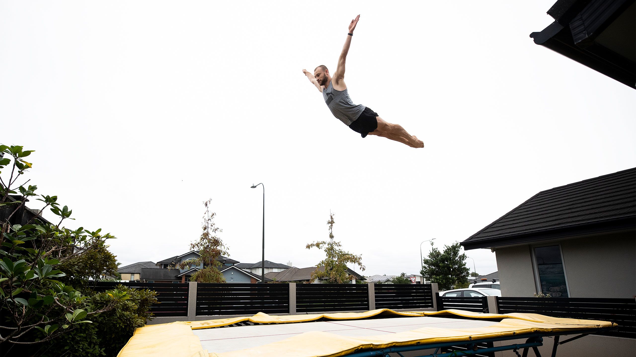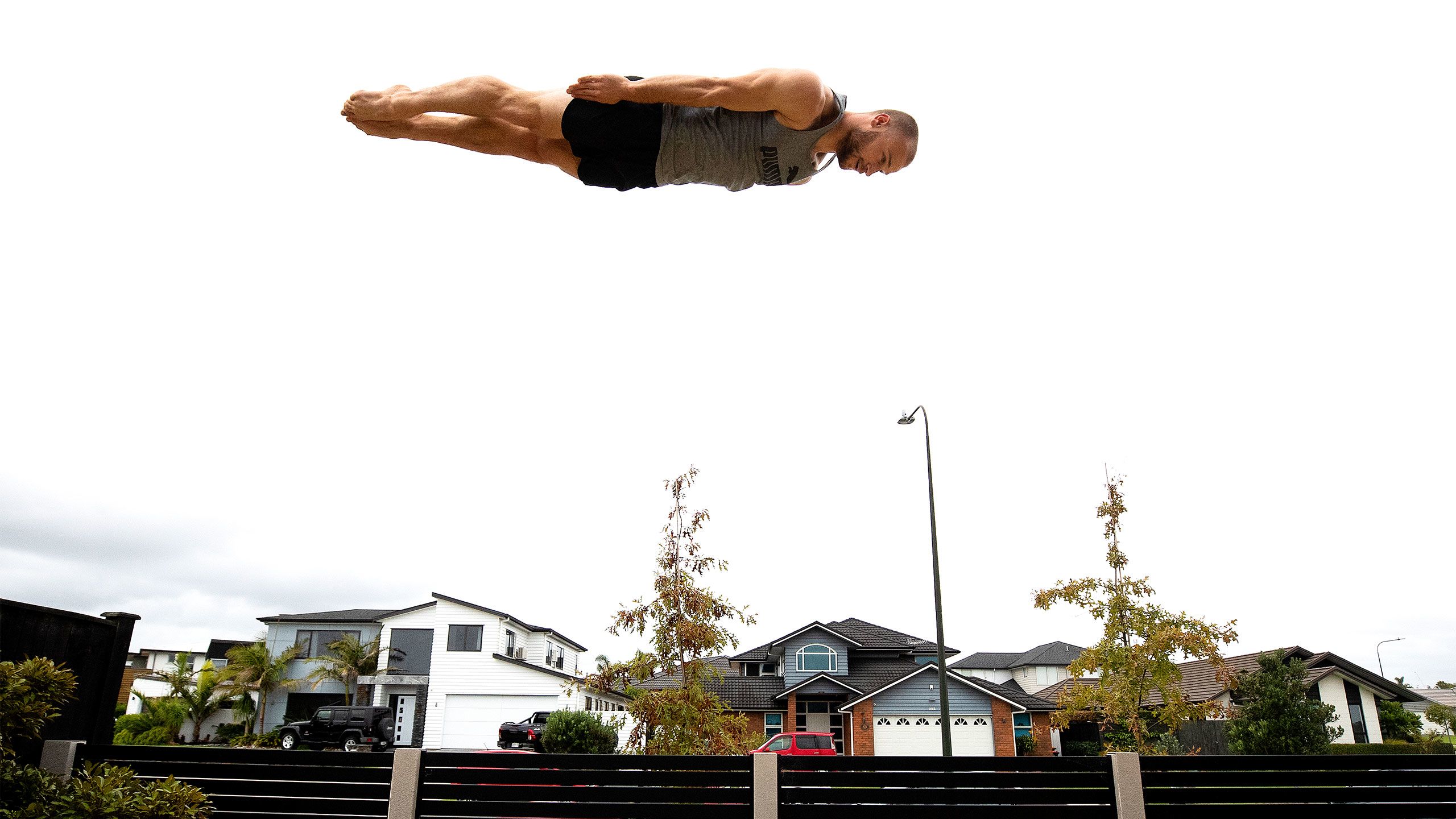 /**span.lightHighlight**/In a quiet subdivision in Karaka, Olympic trampolinist Dylan Schmidt soars high above the rooflines./*/*