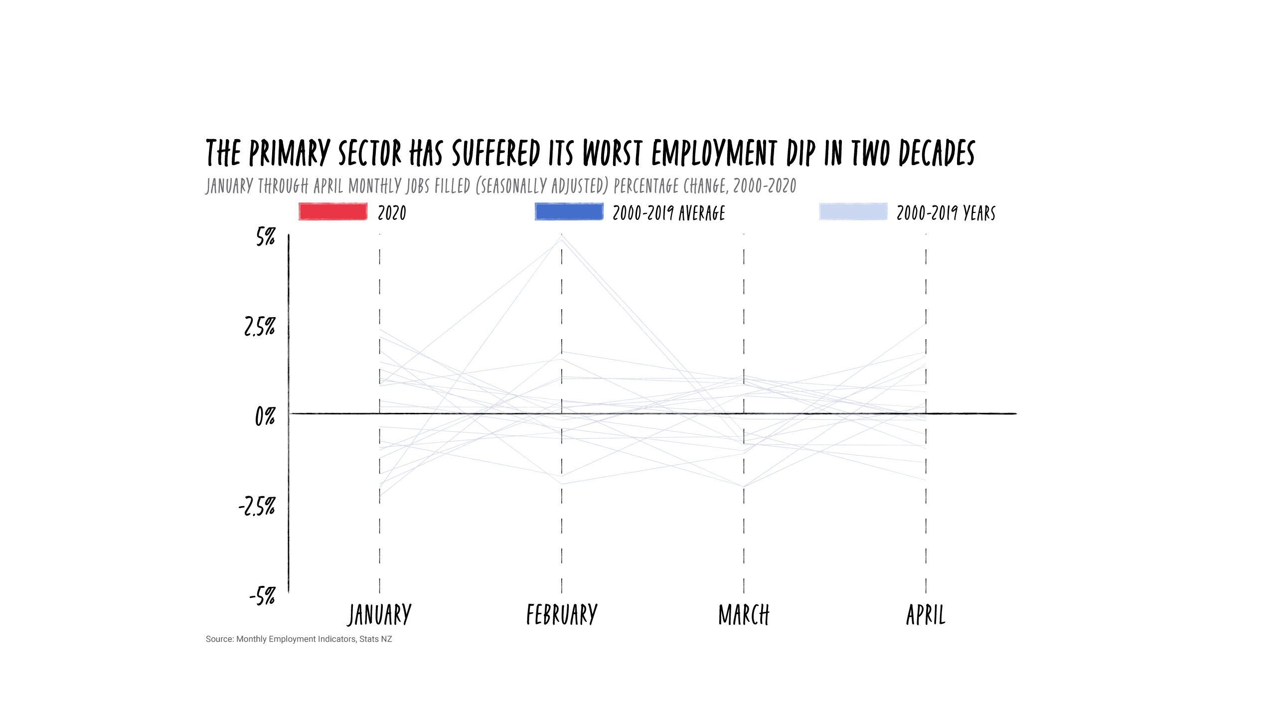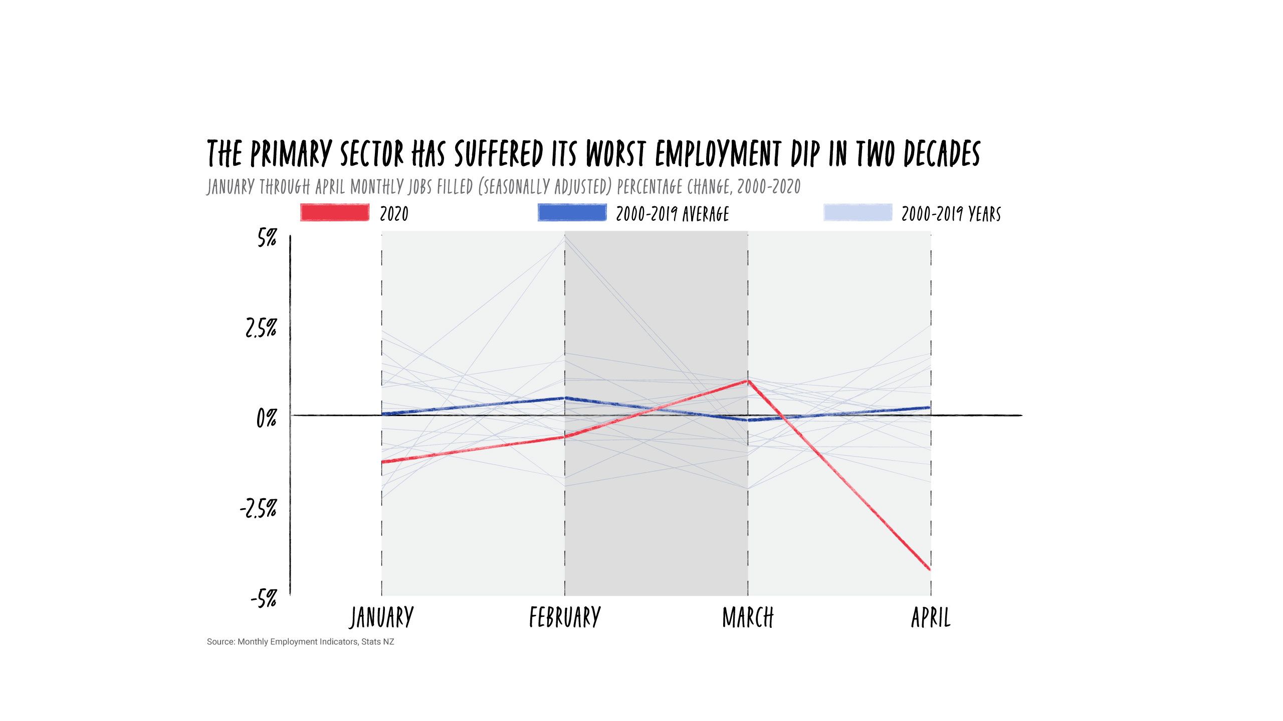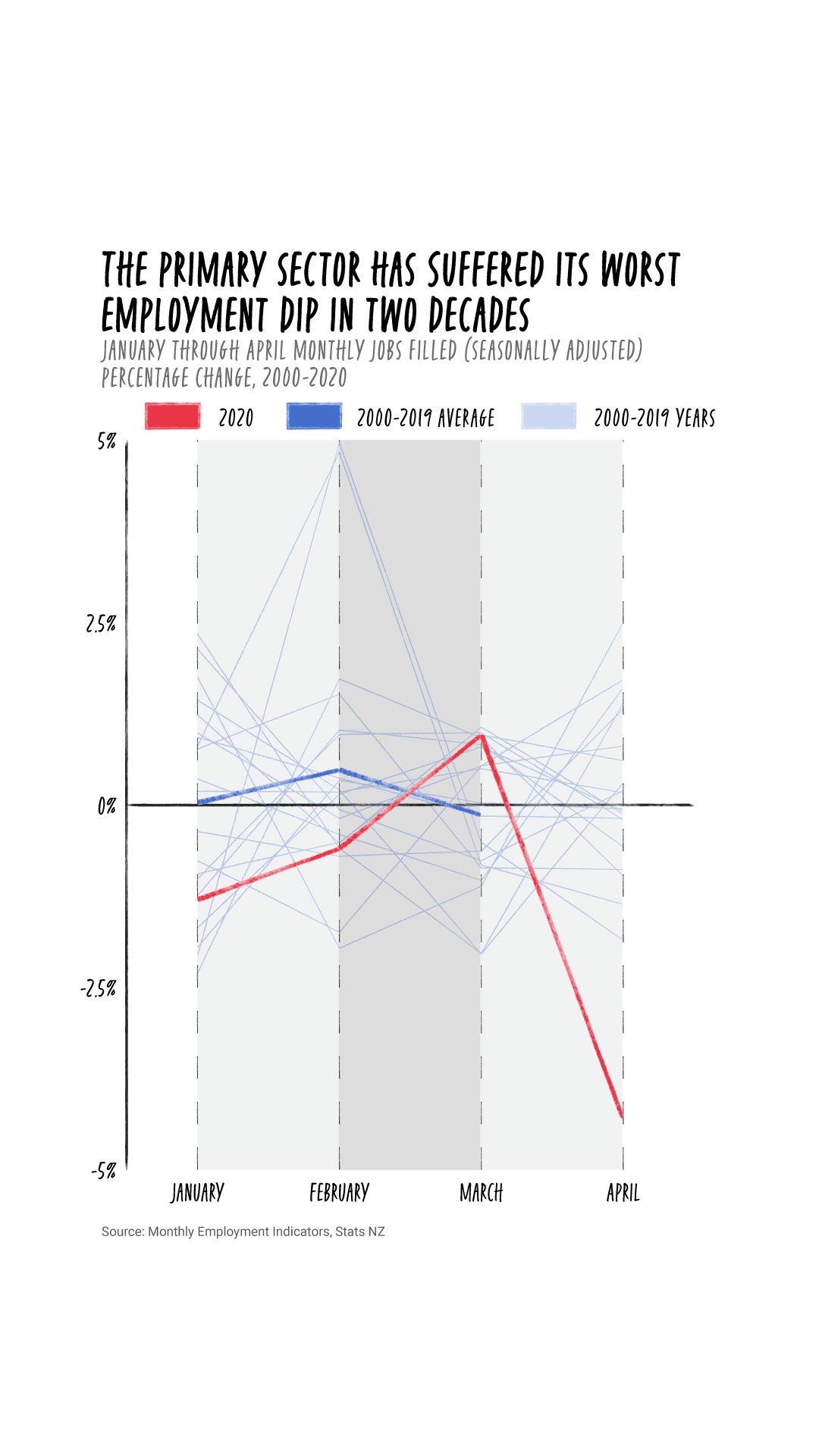 Further analysis of Stats NZ data by Stuff reveals that in April, jobs filled in the sector - which includes agriculture, fishery, forestry, among other industries - fell by 4.3 per cent, a contraction not seen since May 1999. This was more than double the 1.7 per cent contraction seen across all industries.