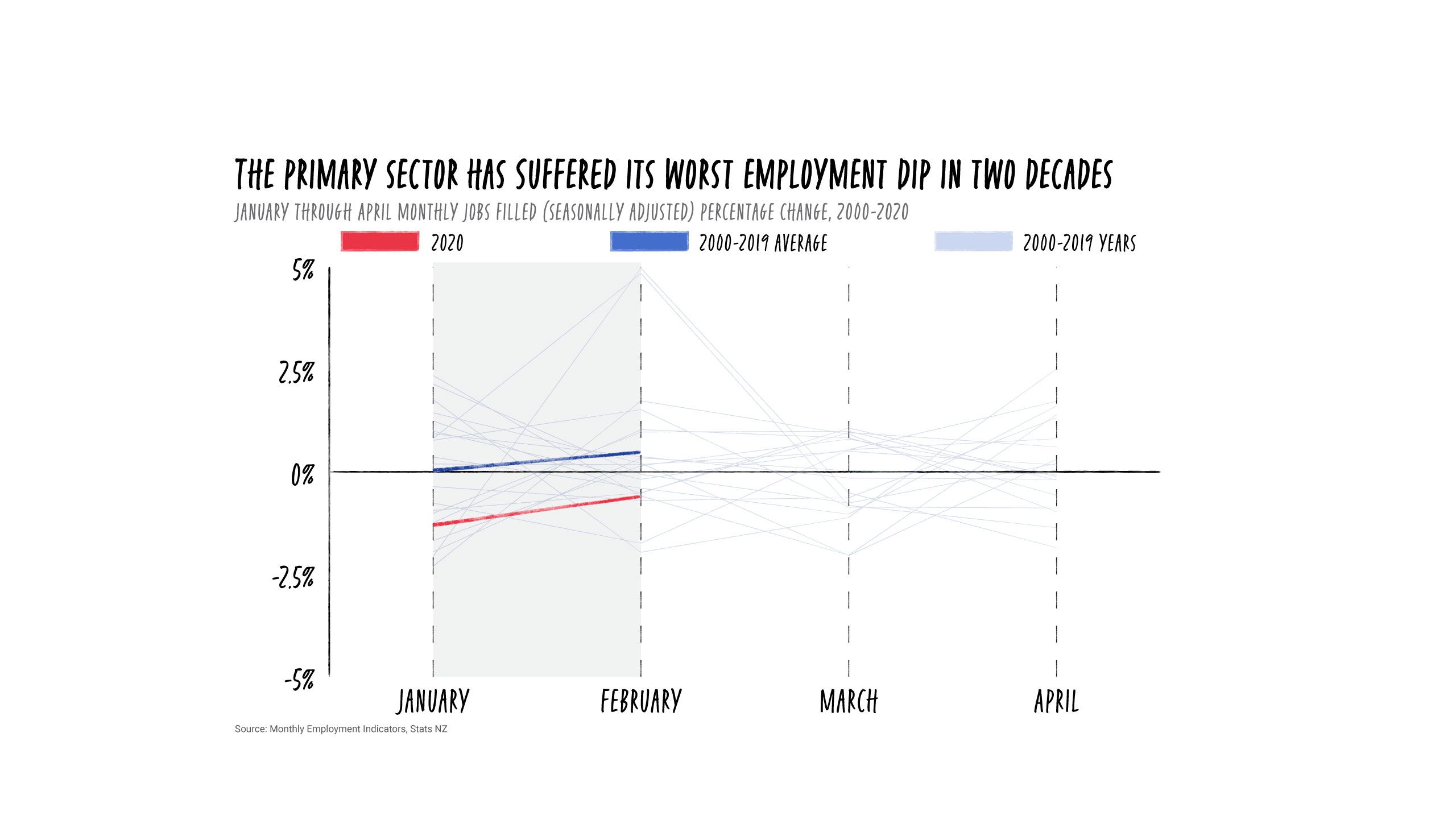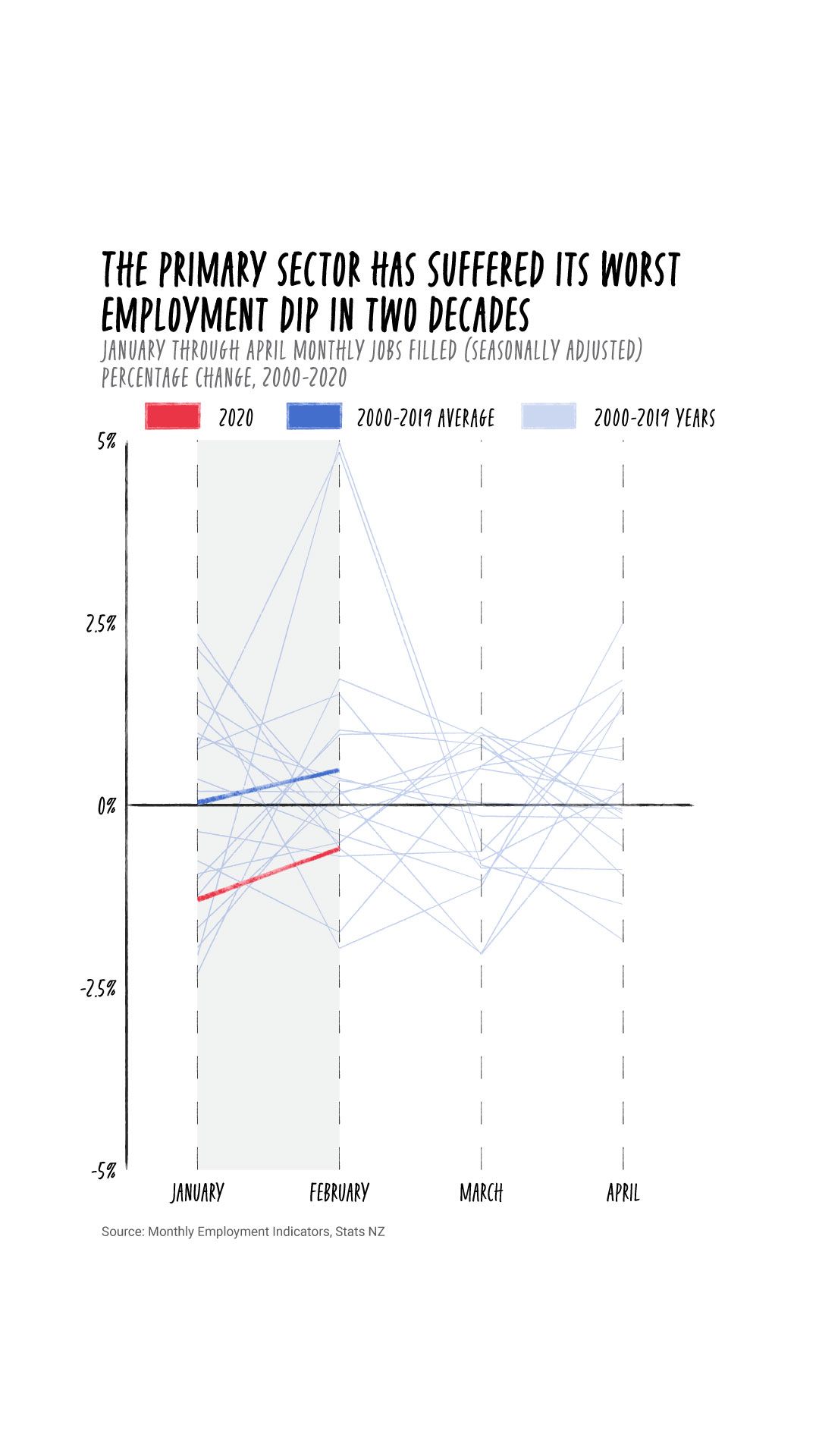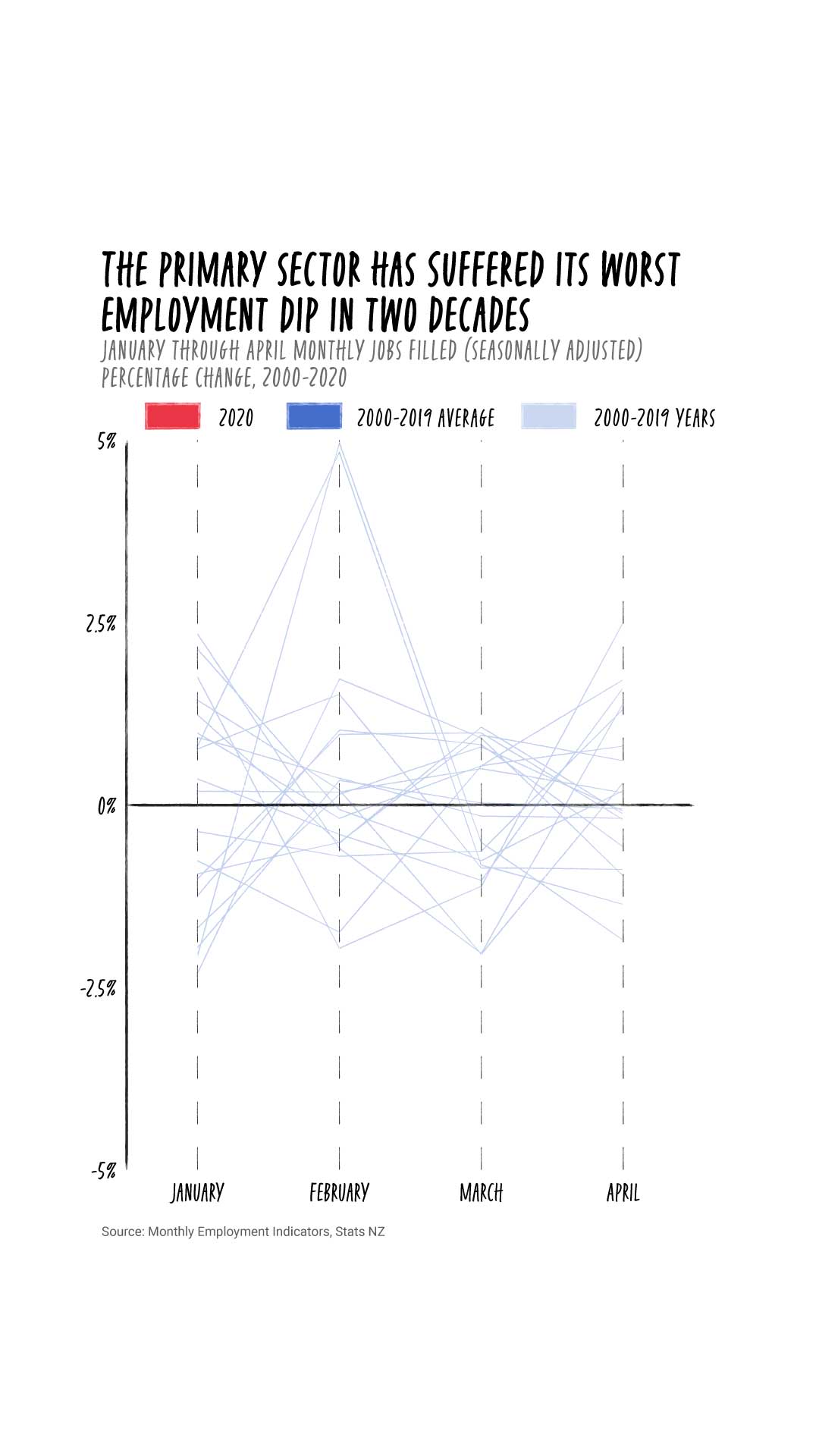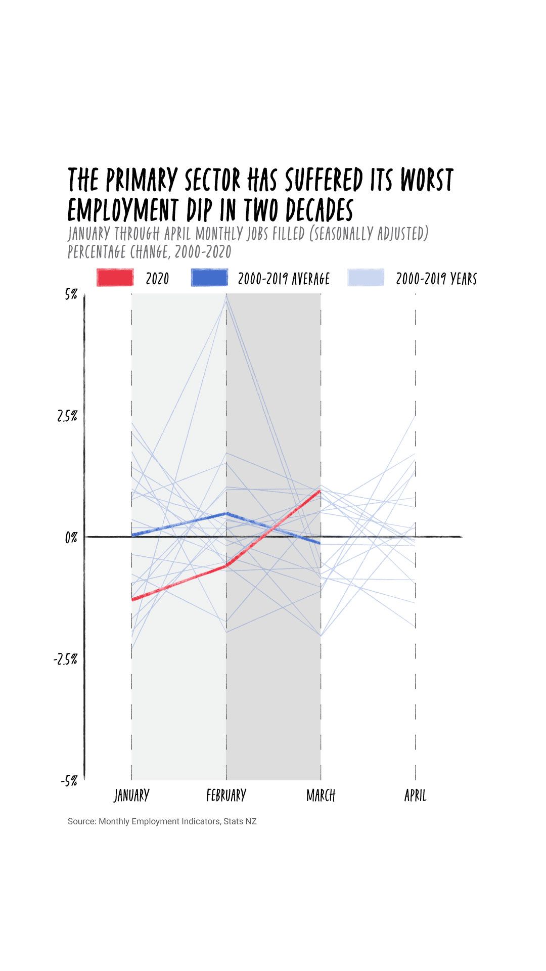 Further analysis of Stats NZ data by Stuff reveals that in April, jobs filled in the sector - which includes agriculture, fishery, forestry, among other industries - fell by 4.3 per cent, a contraction not seen since May 1999. This was more than double the 1.7 per cent contraction seen across all industries.