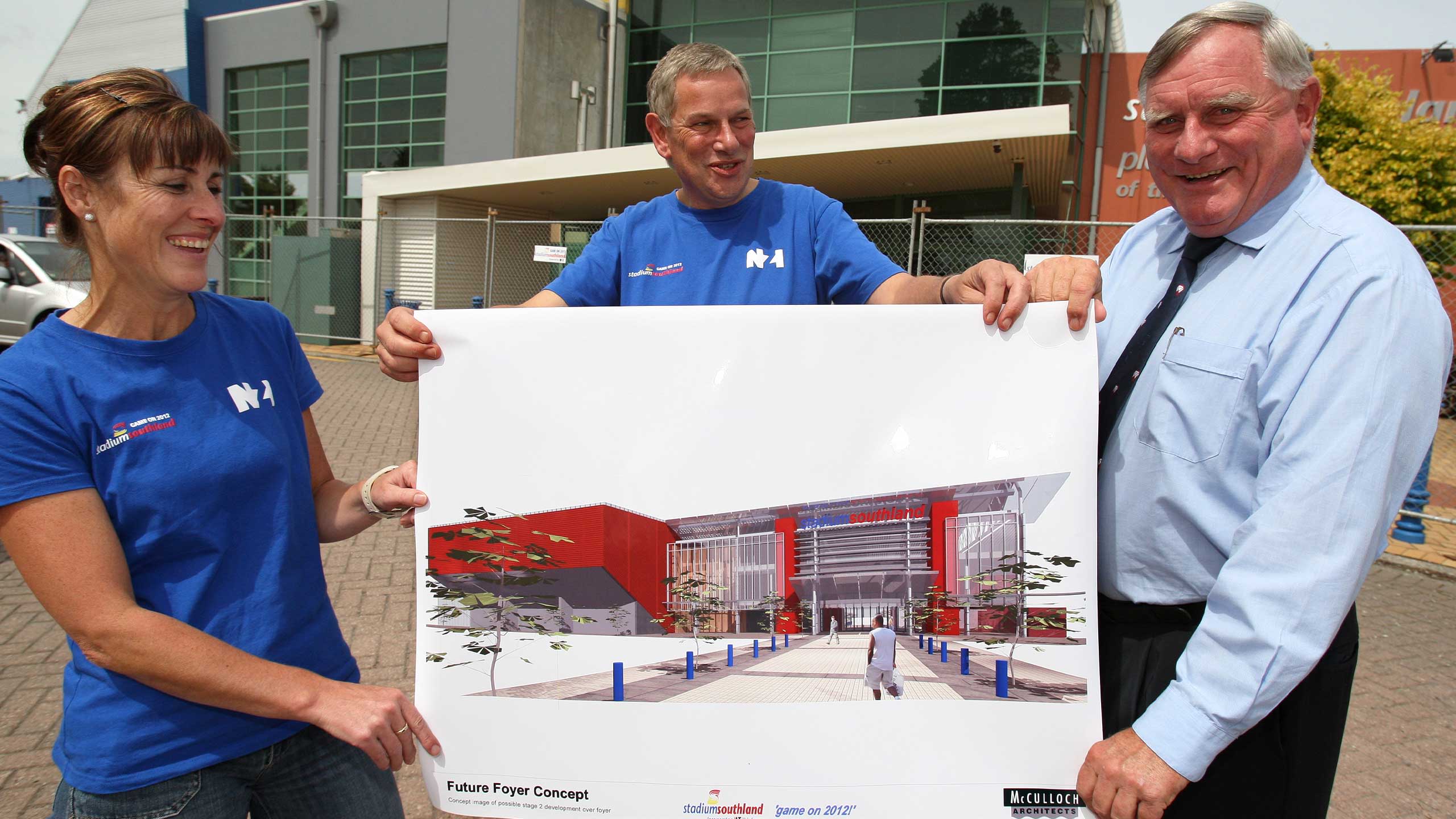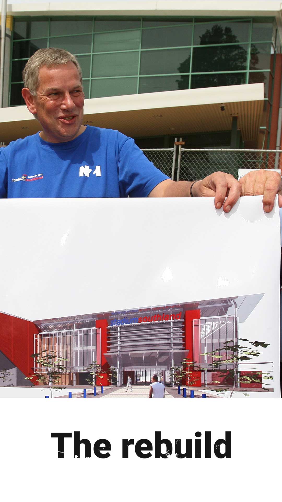 Southland Indoor Leisure Centre Charitable Trust board chairman Acton Smith quickly joined Skelt and Harper on site.