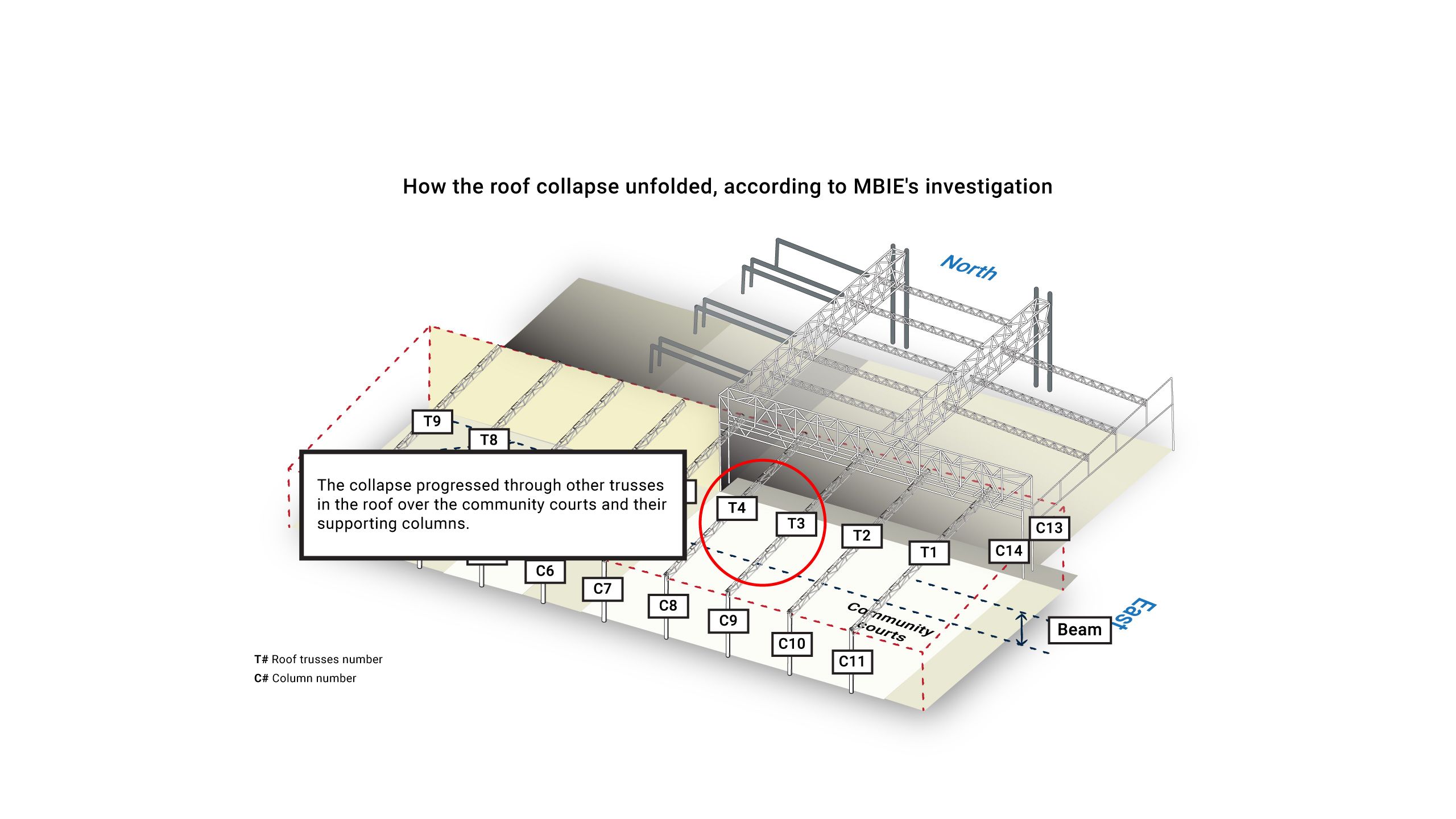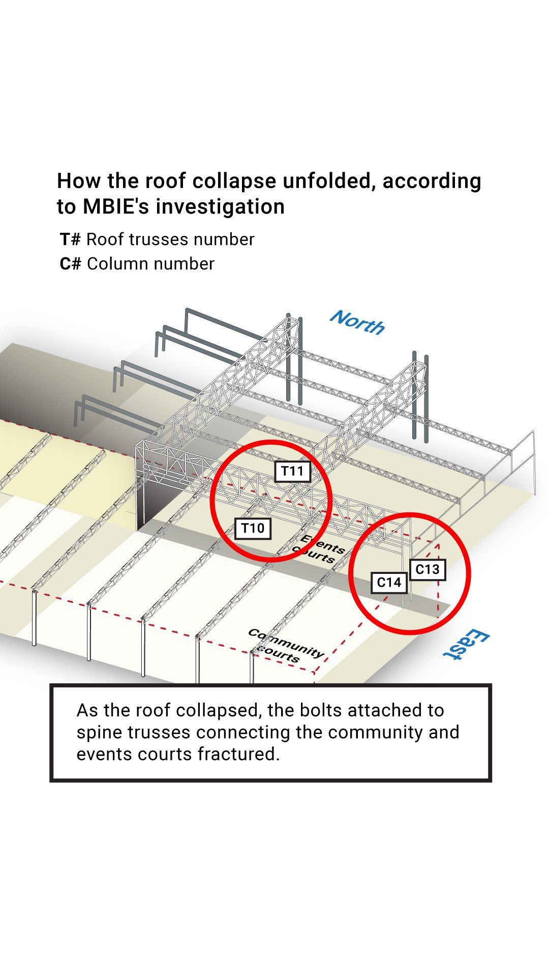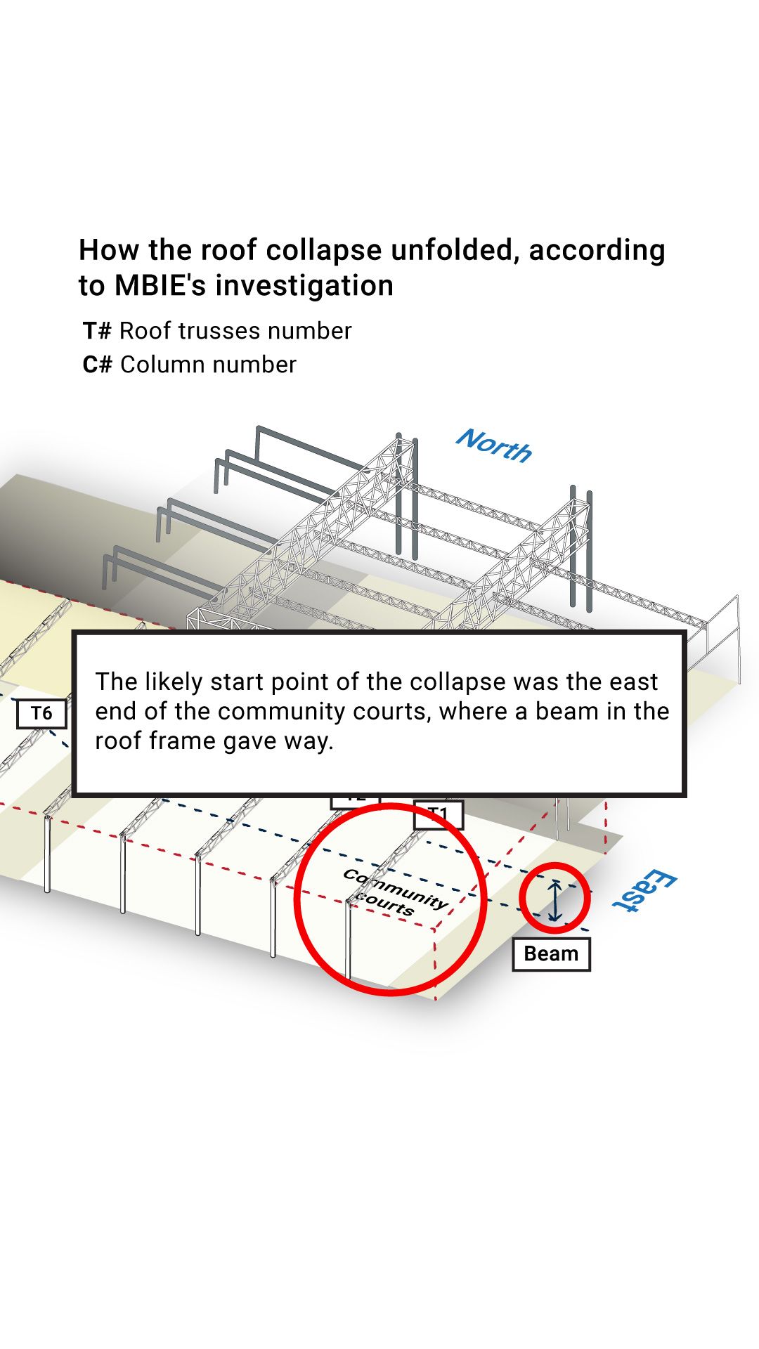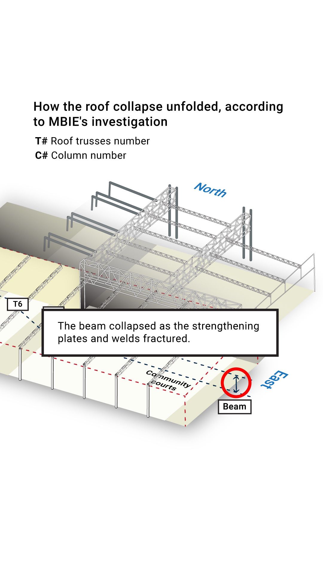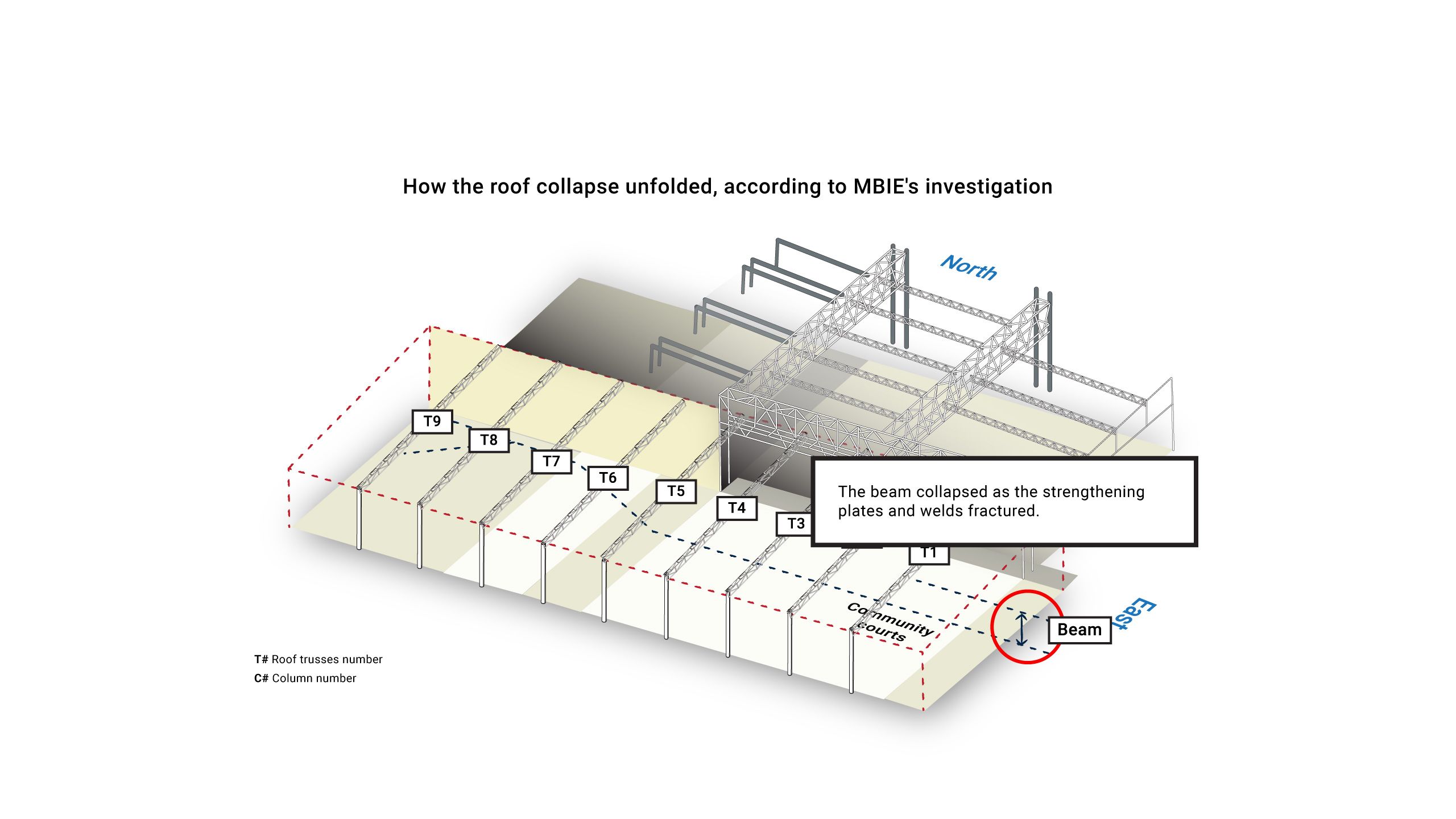 The report found the collapse is likely to have started in one of the roof beams which ran across the eastern end of the community courts.