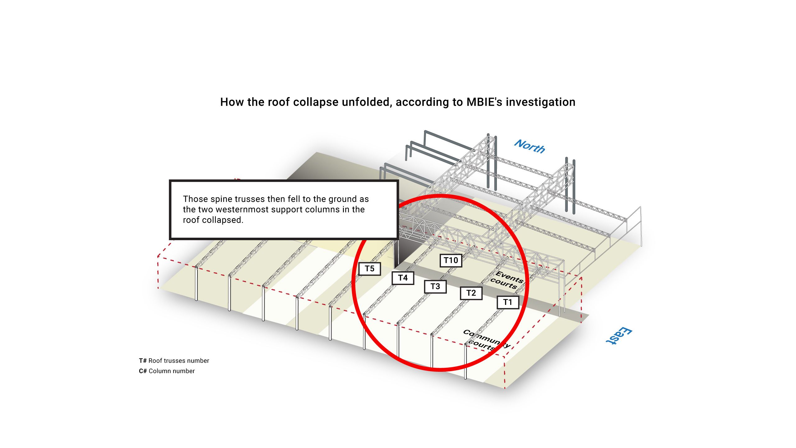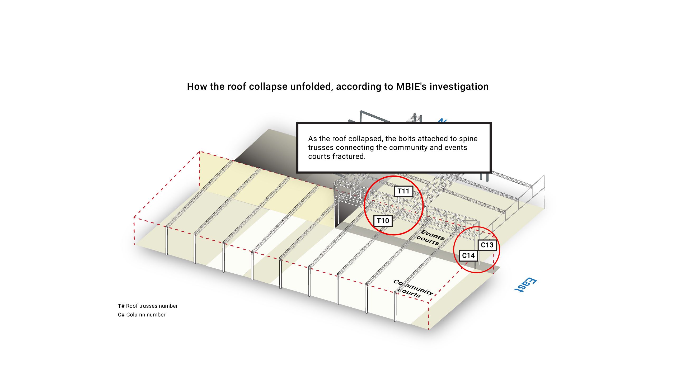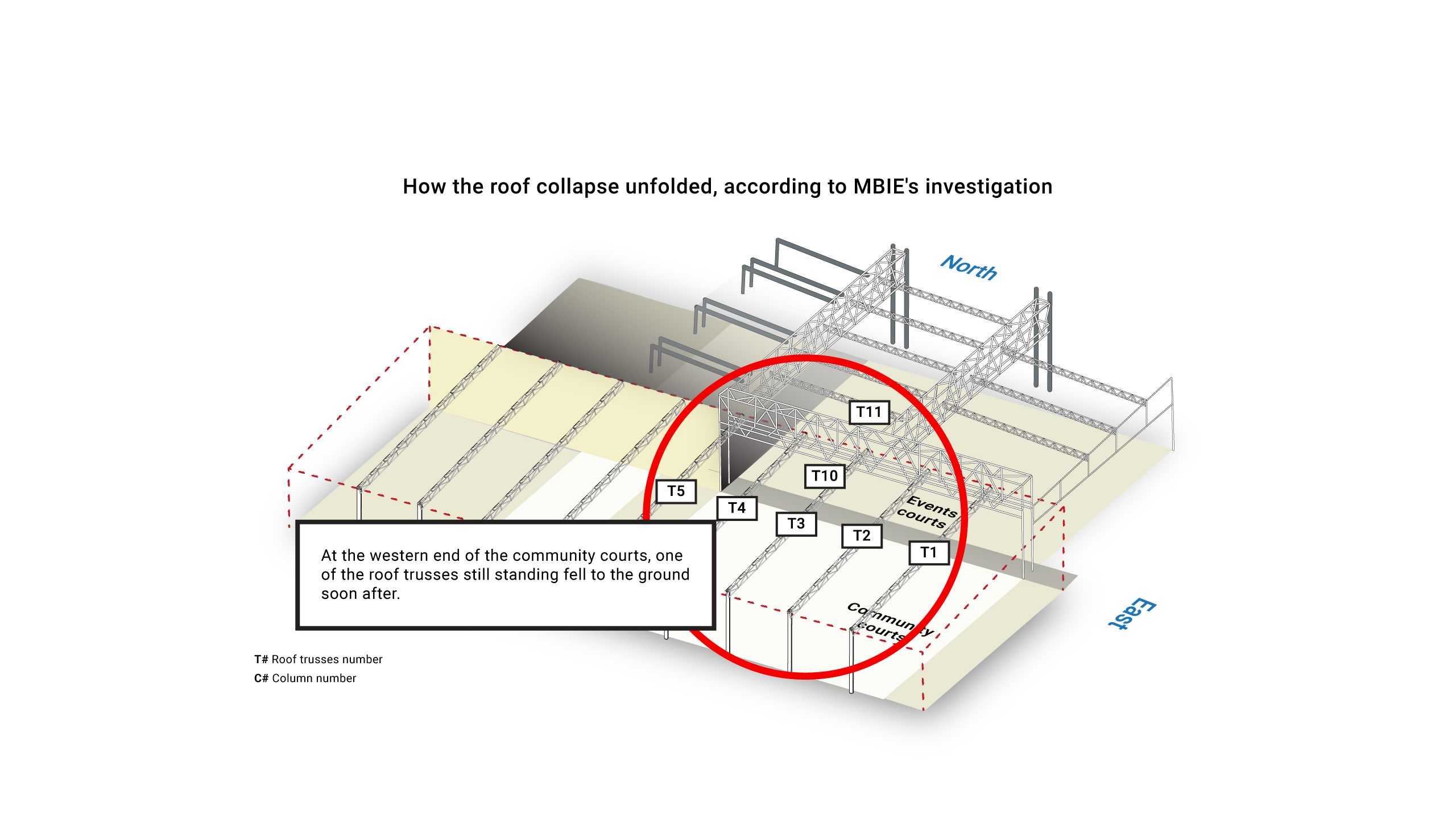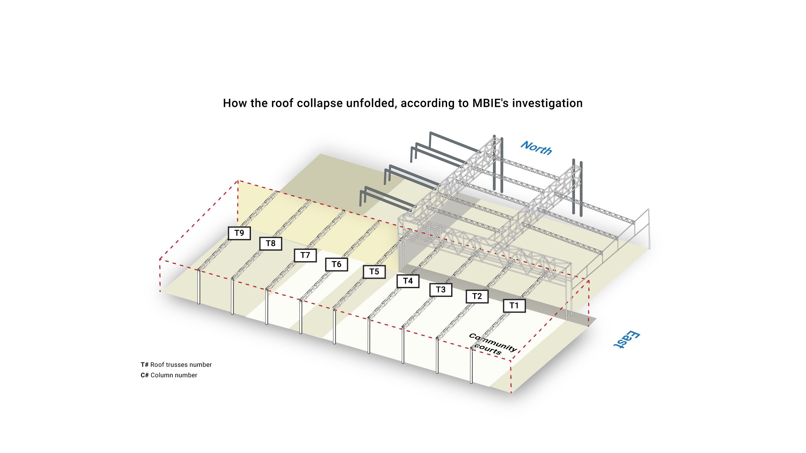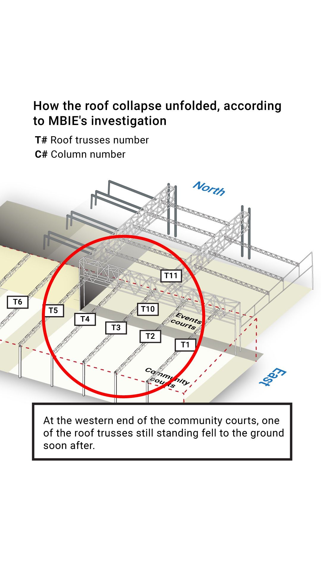 The report found the collapse is likely to have started in one of the roof beams which ran across the eastern end of the community courts.