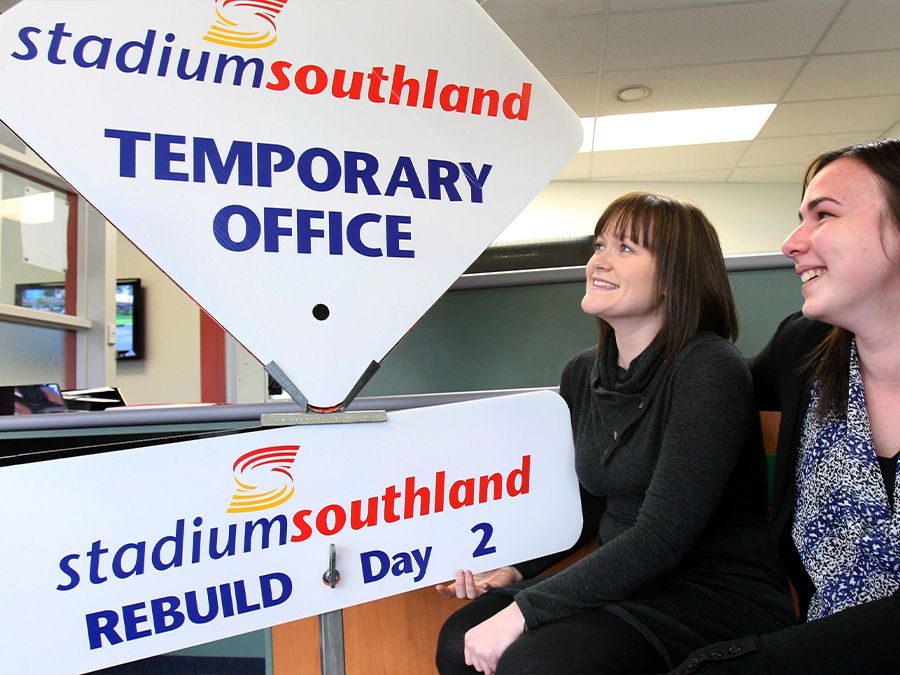 Sport Southland operation administrator Sarah Brown, left, and, Stadium Southland administration co-ordinator Michelle Grant at the temporary stadium office in the early days of the rebuild in 2010. (Robyn Edie/Stuff)