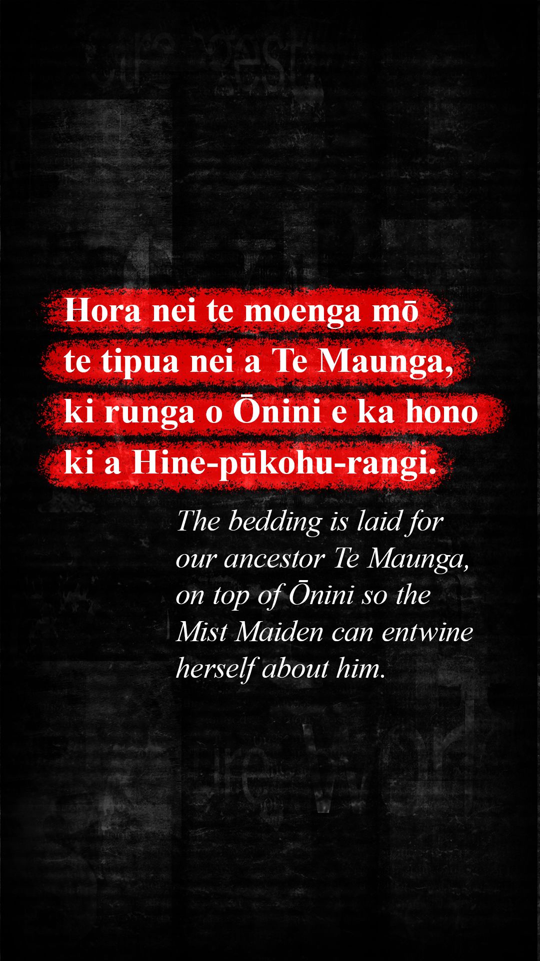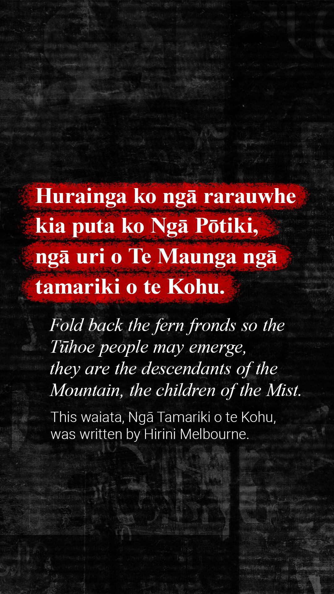 Among their varied creation stories, Tūhoe are said to be the descendants of Pōtiki-tiketike, a child born of natural entities: Te Maunga, and Hinepūkohurangi in the heart of Te Urewera.