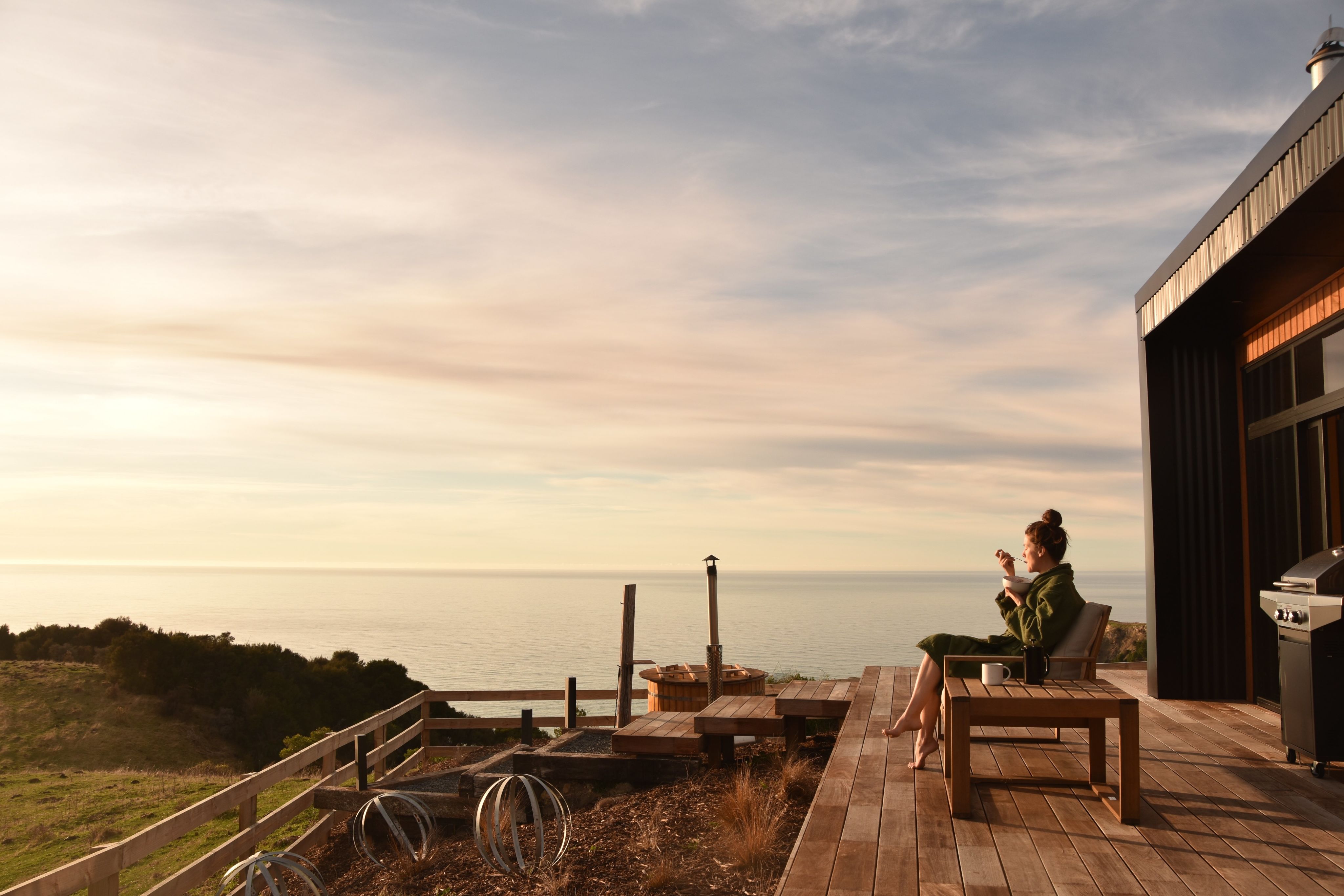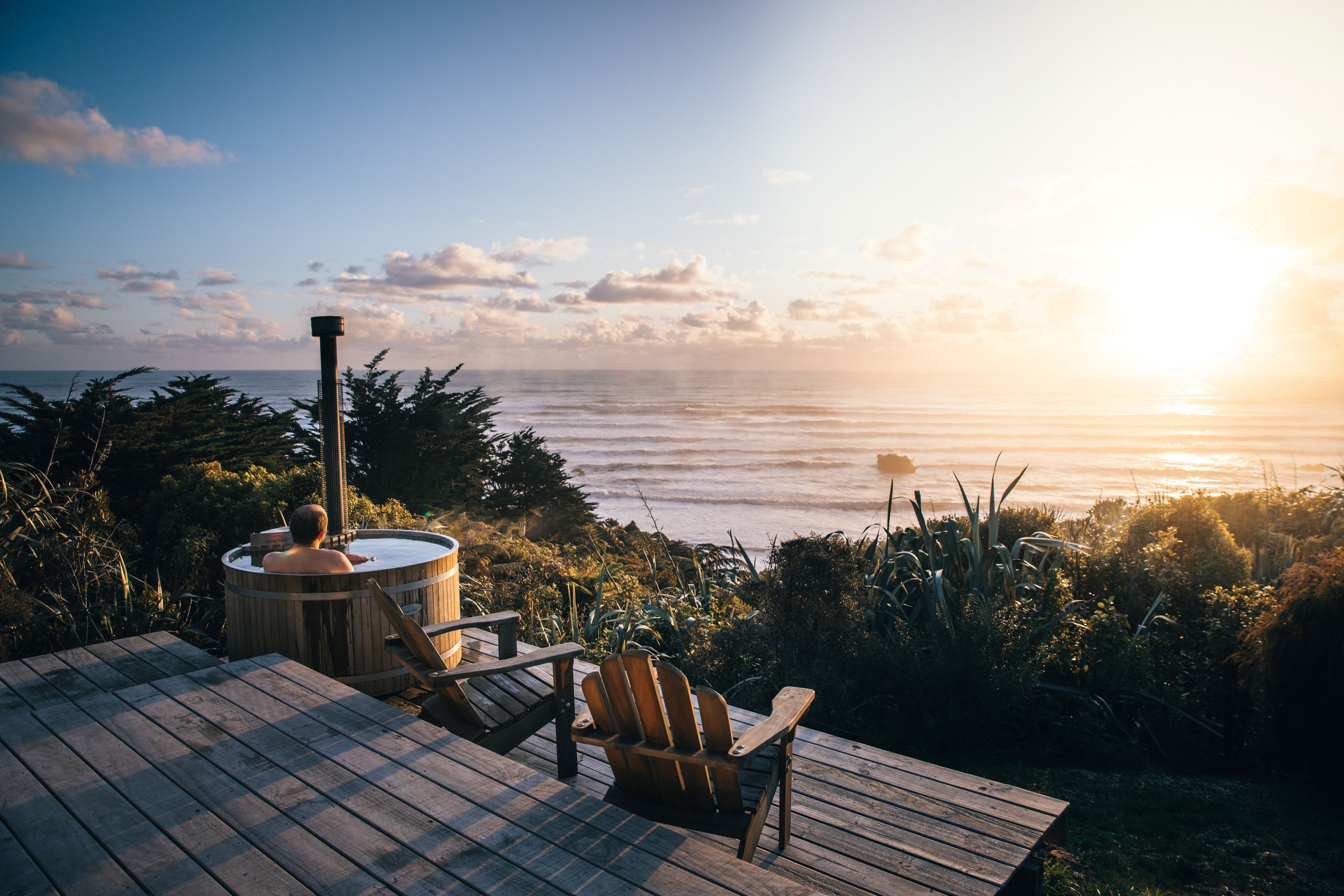 There is nowhere better to sit and watch the sunset over the West Coast than right from the wood-fired spa on the deck of Fox Hut. The adults-only cabin has views to die for and offerings that put the traditional good-old Kiwi hut to shame.