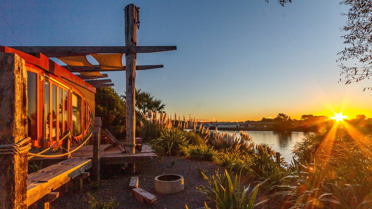 Whanganui's Iona Tiny House is an old kauri riverboat turned on its side and transformed into a luxury tiny house. The boat is firmly on land, a few steps from the Whanganui River. It is a passion project of architect Elinor McDouall, who has meticulously designed the tiny house to feel remarkably spacious. The lounge has a large curved couch that runs along the hull and sits in front of a woodburner, the middle part of the boat has a surprisingly spacious kitchen, while the other end of the cabin is home to the bed, where you can watch the river without lifting your head off the pillow. Read more