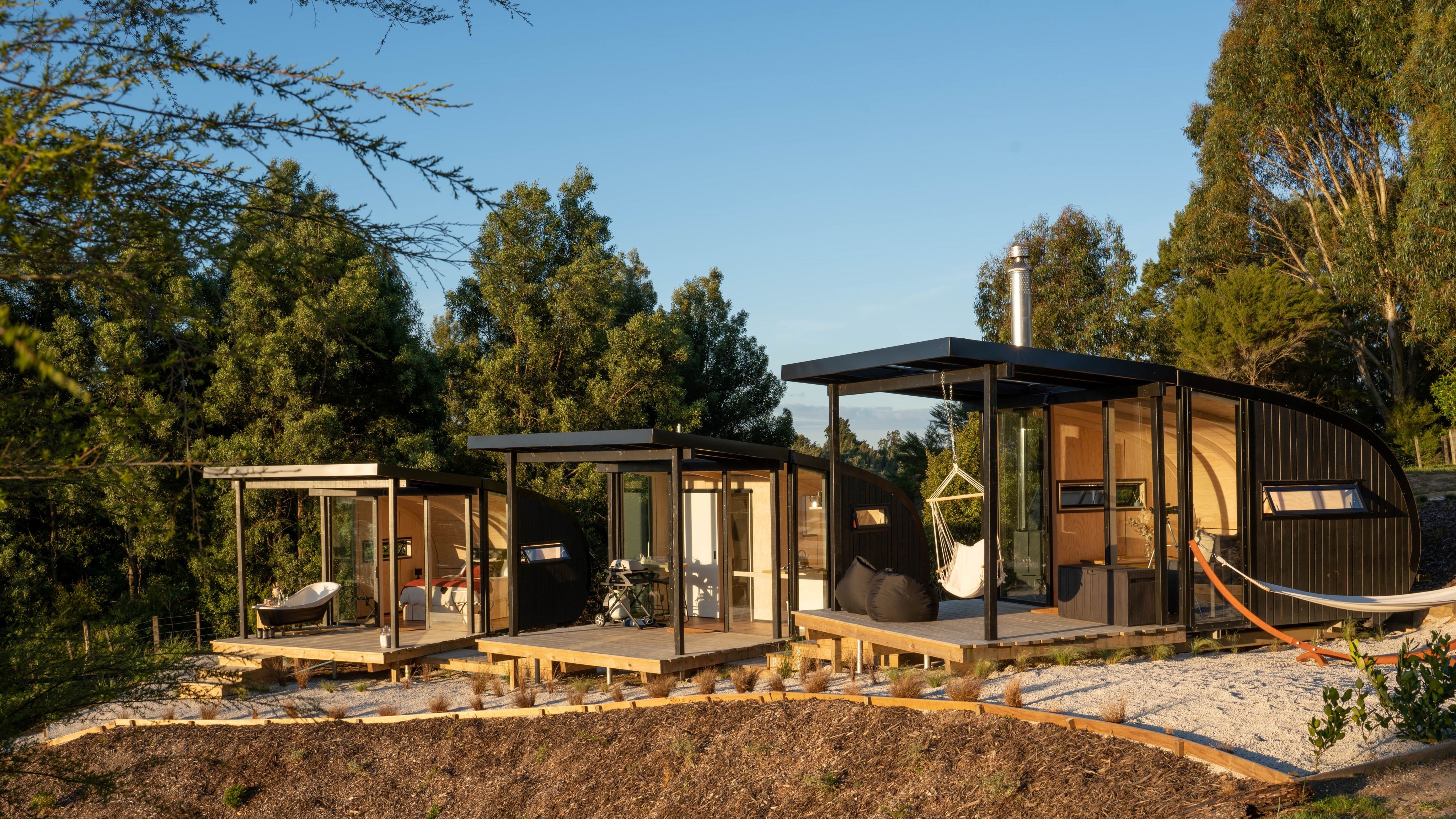 Tucked away on a quiet corner of a rolling farm, Jo Wilson and Dean Dew have a secret little spot called Kokako Retreat. After a self-guided drive across the farm, guests are greeted by three pods. The first is relaxation central – it has a comfy couch in front of a fire, bean bags and a swing chair with sweeping views. The second has a neatly appointed kitchen and bathroom and the last is home to a large plush bed, overlooking the bush, with a clawfoot bath out front. The tiny home retreat is designed for couples. Read more