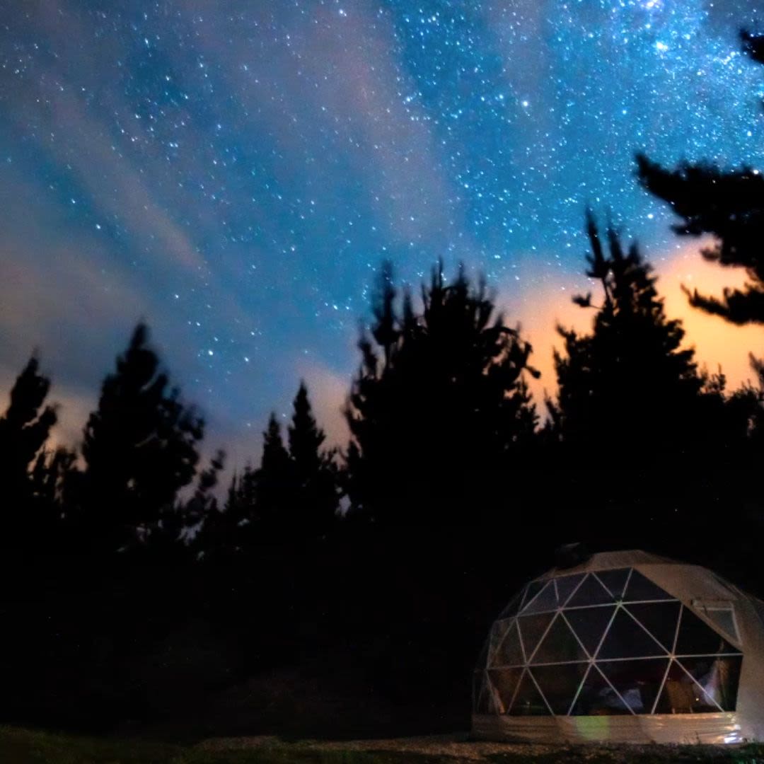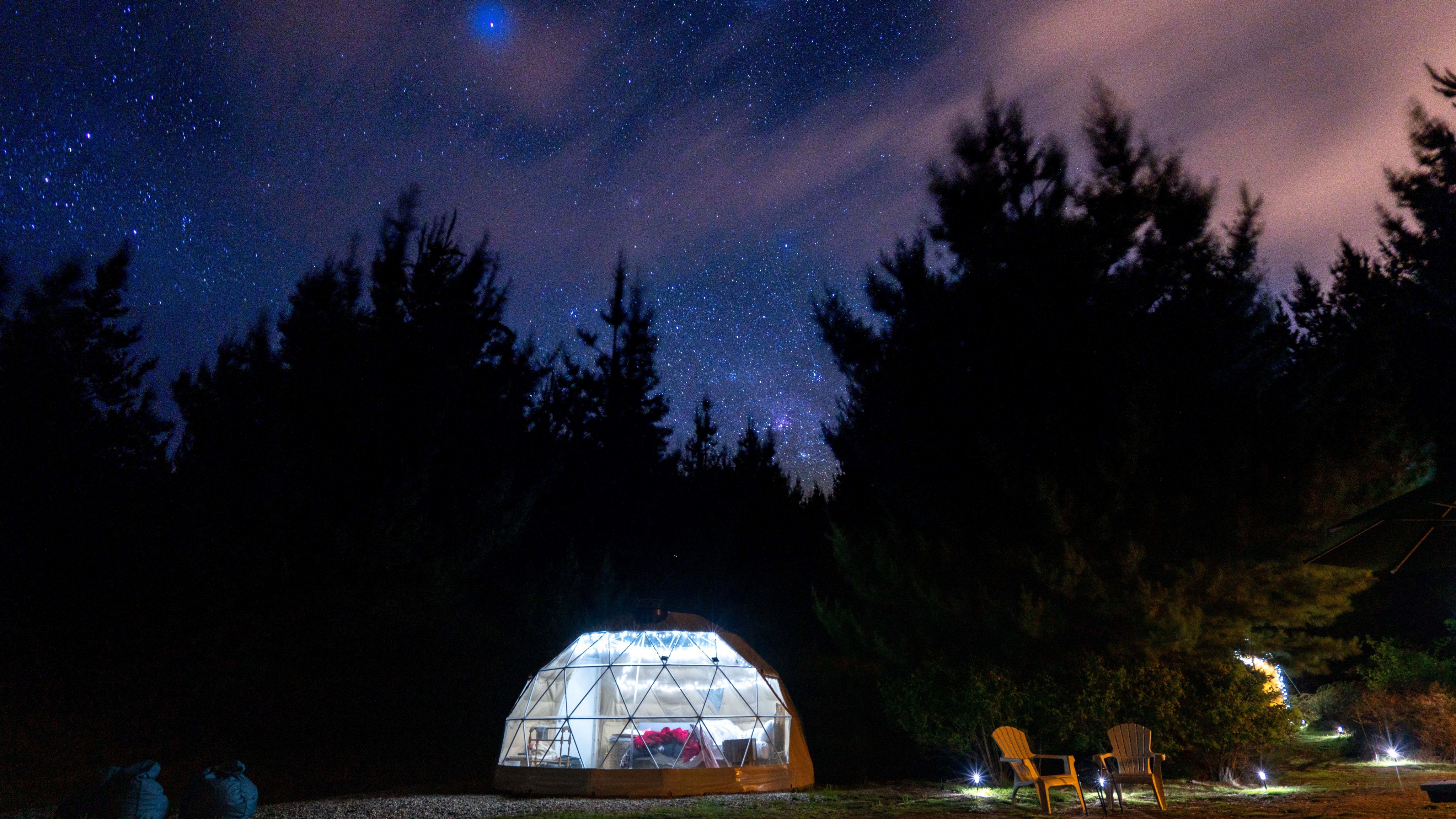 In a quiet little corner of Lake Wānaka, Mt Gold Glamping is a luxury off-grid glamping escape, designed for marvelling at the Milky Way. The perfectly appointed little camp was established by Amy Northcott and her husband Mike in an effort to introduce more people to the outdoors. There are two star domes on the private farm. The bed is positioned under a section of transparent roof so you can watch nature's greatest light show unfold above you. Just below the tents is a gas fire, with seating and a hammock. Read more